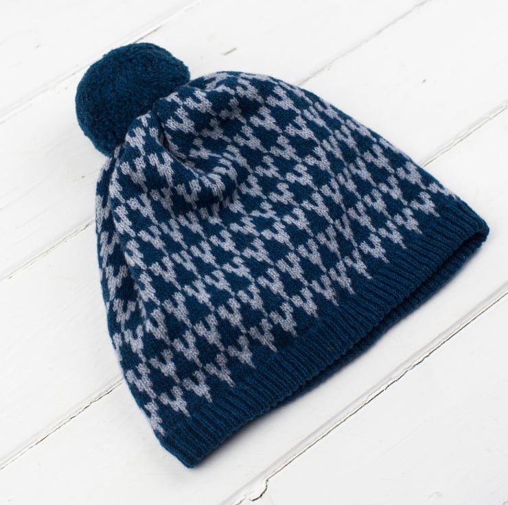 Knitted pom pom hat in a geometric arrow pattern. Knitted in Scotland from high quality British spun lambswool.