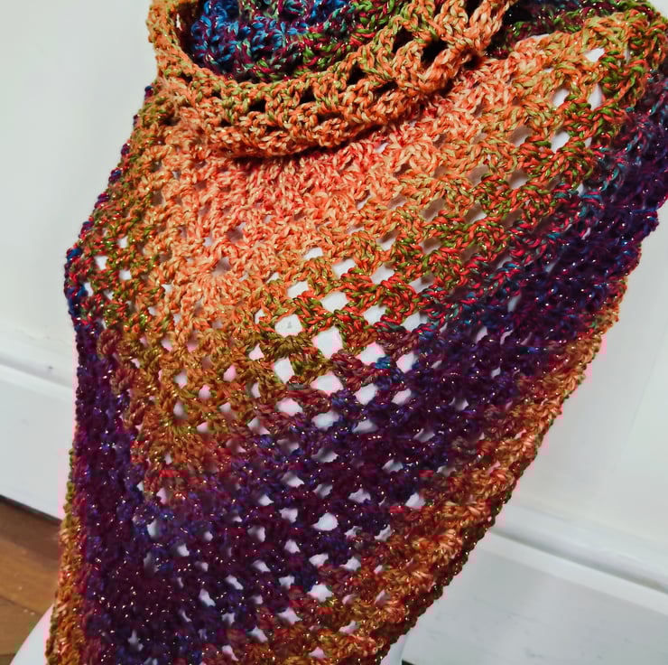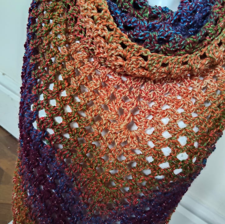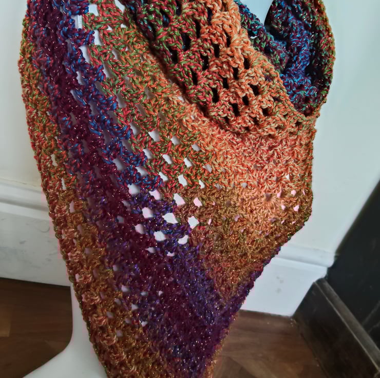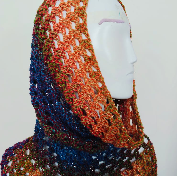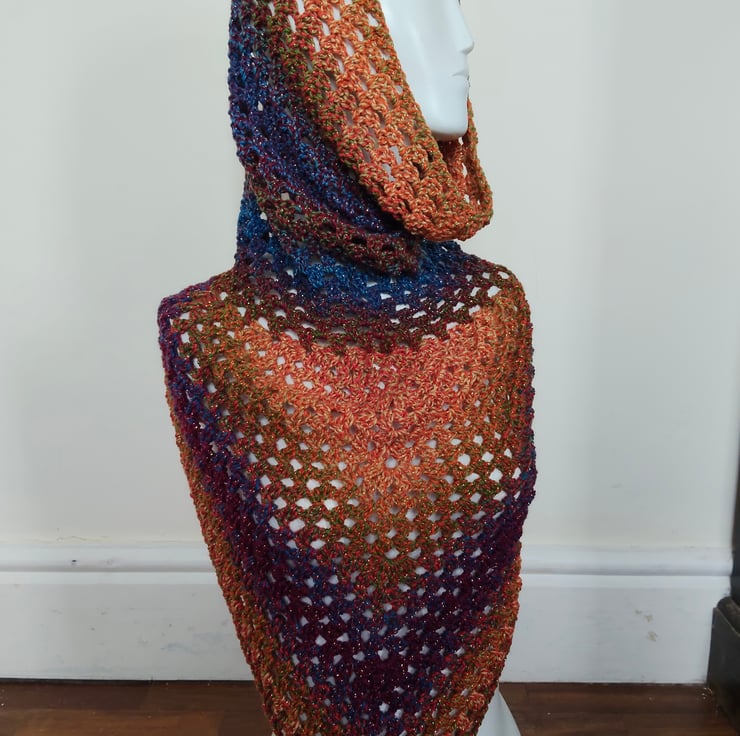 Crochet triangle scarf in variegated brown blue and gold yarn, with a sparkle shimmer woven through. Soft and snuggly without being too heavy this accessory can be worn in a variety of ways. It has a snood hood which can be pulled up for head warmth or down for added neck protection, this scarf is a perfect addition to any outfit