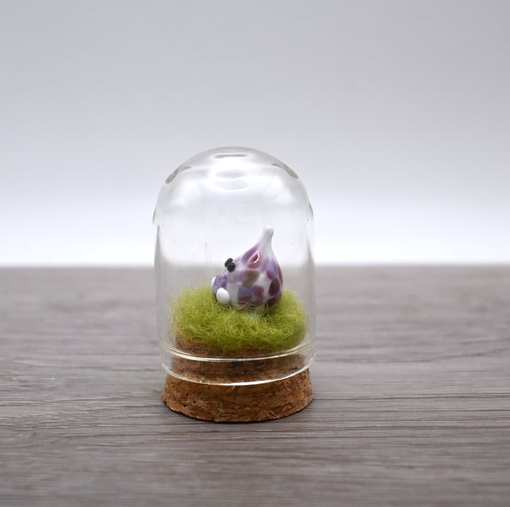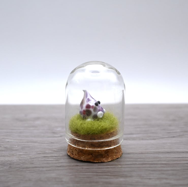 It features green fibre and a handmade lampwork glass wisp holding a heart.