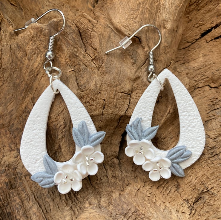 Pretty handmade floral white and silver polymer clay earrings, with additional glass seed beads. Perfect for weddings or special occasions.