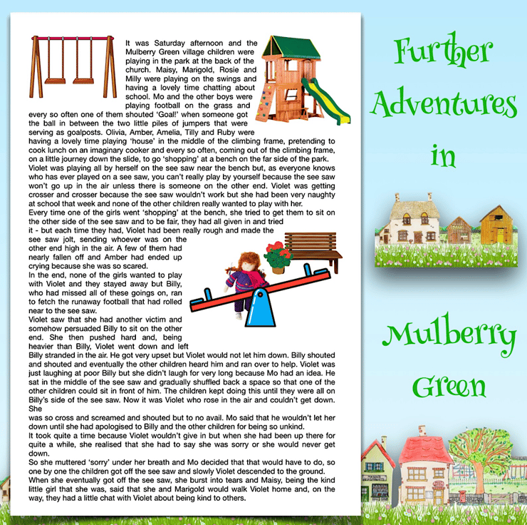 In the village there is a post office, a bakery, a sweet shop, a hardware shop, a greengrocer’s, a sewing shop, a butcher’s and a grocer’s.There is also a little church and, of course, a school – Mulberry Green Infants’ School, where Maisy and Mo are pupils.