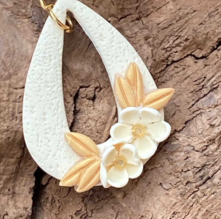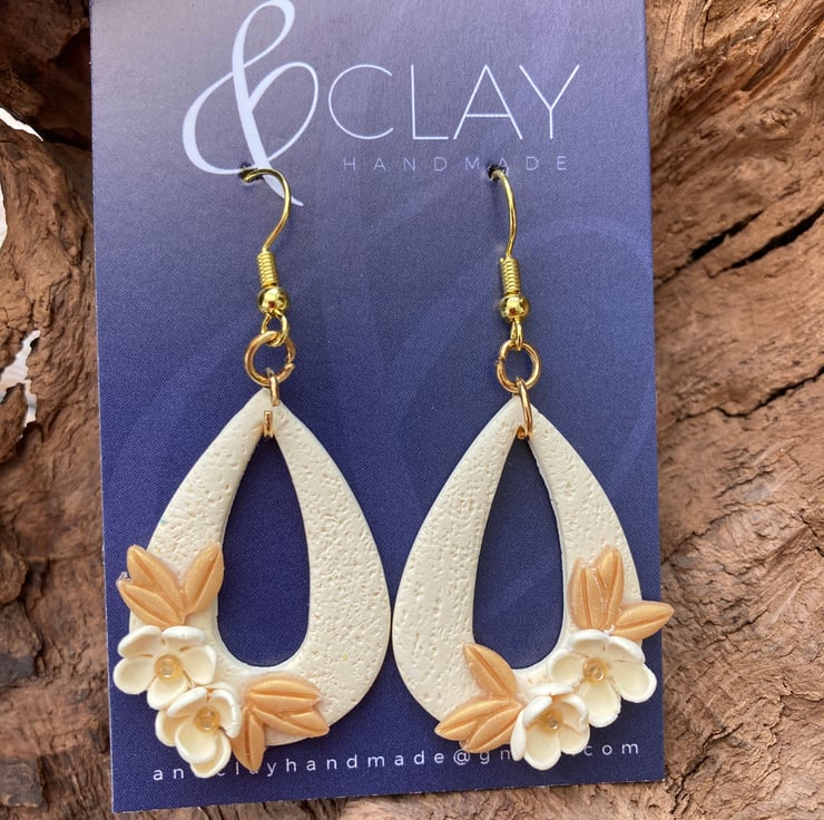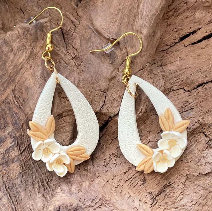 Pretty handmade floral cream and gold polymer clay earrings, with additional glass seed beads. Perfect for weddings or special occasions.