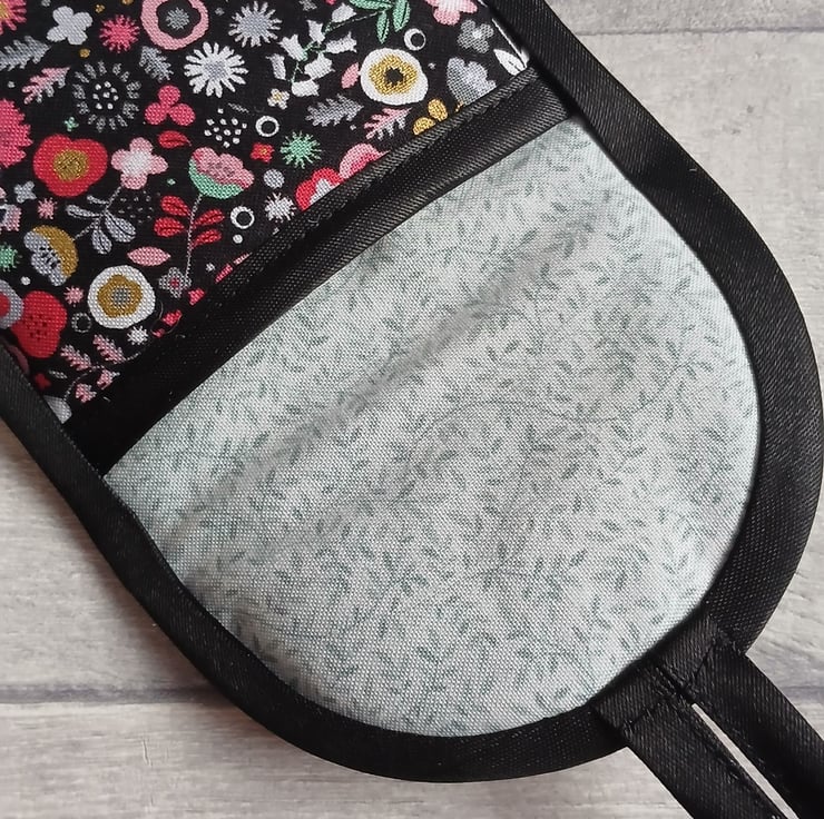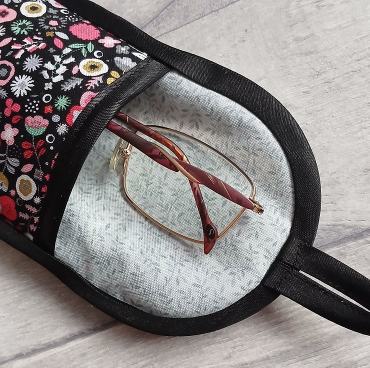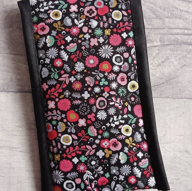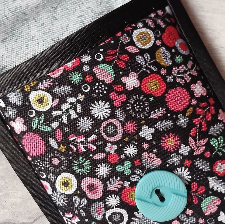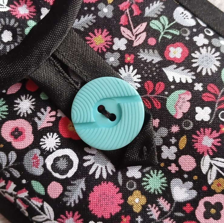 Something a bit different, I've used a modern floral print in shades of coral pink, grey, duckegg and white on black to make this smart storage pouch which could be used for glasses, a phone or general storage. It's lightly wadded to protect the contents and is lined with a co-ordinating fern print. I've finished it with black satin bias binding, and a loop and button fastening (a lovely vintage, Art Deco style button).