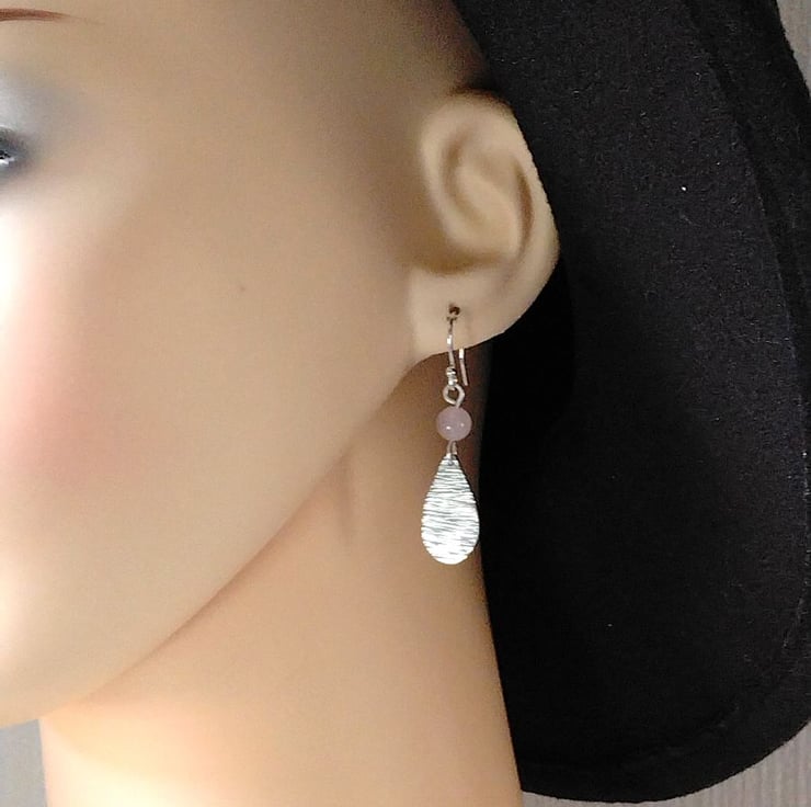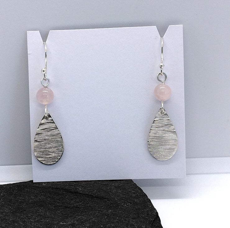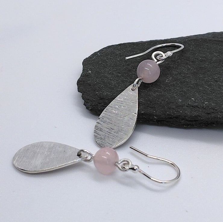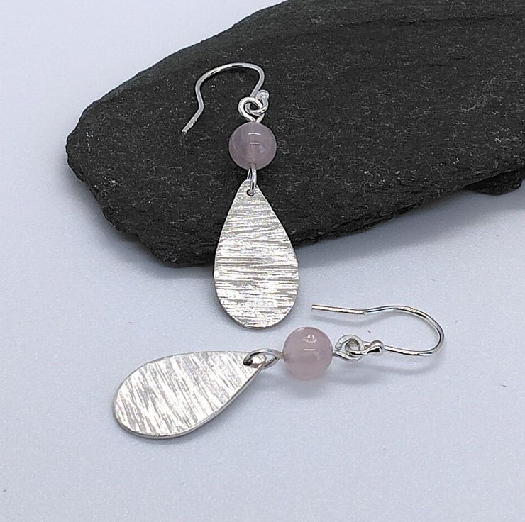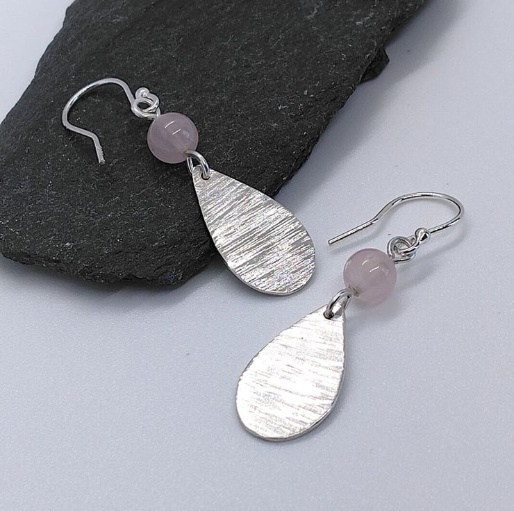 Handmade sterling silver teardrop earrings with texture, topped with a 6 mm round Rose Quartz gemstone bead