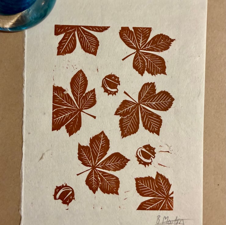 A perfectly imperfect hand burnished print of a lino cut taken from my original sketch of horse chestnut leaves and conkers. The first photo shows the print you will receive.