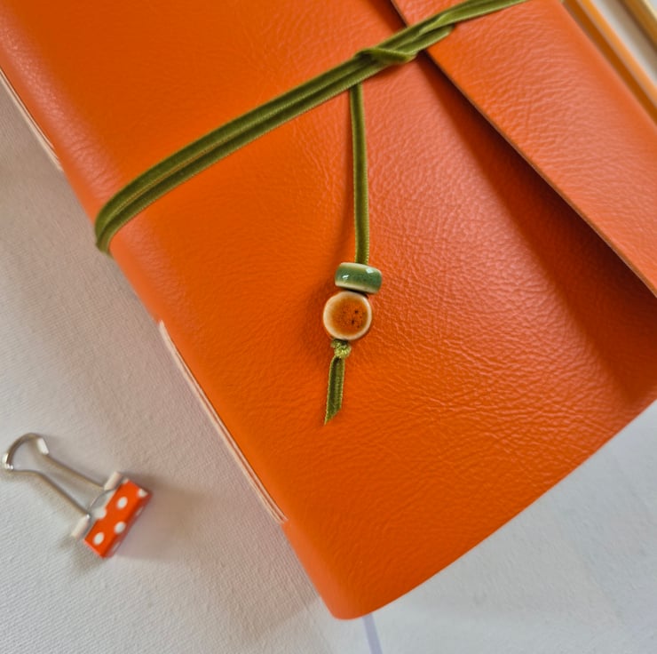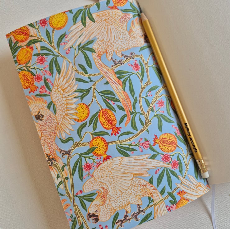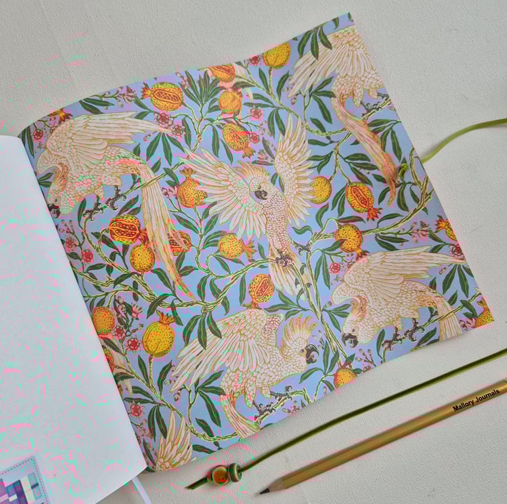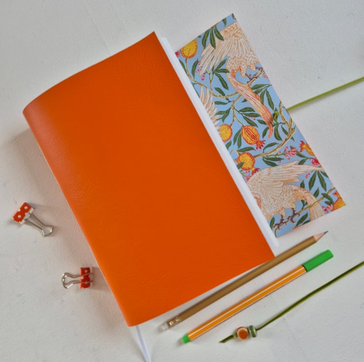 Beautiful Bright Orange Italian Leather Journal, Hand Bound and lined with a stunning Cockatoo and Pomegranate design in Green, Orange and Blue. Can be used as a Sketchbook, Journal, Art Journal or Bujo.
