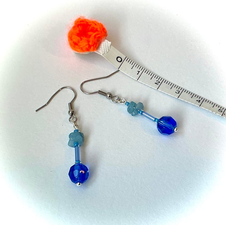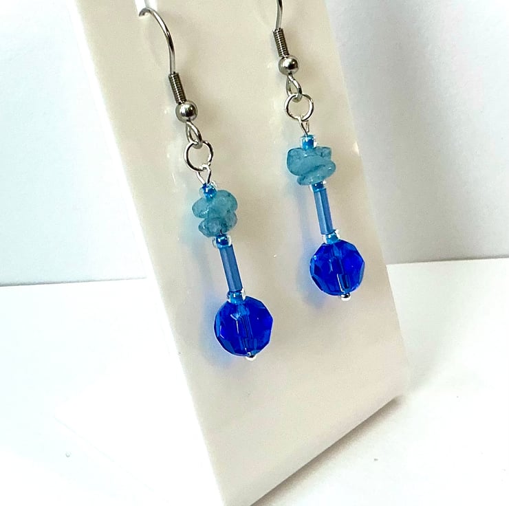 Dangly earrings in a delicately beaded style made using Blue glass beads and paler Blue Aquamarine chips.