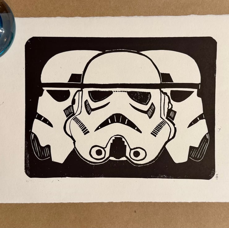 A perfectly imperfect hand burnished Stormtrooper print of a lino cut taken from my original sketch idea, shown in the photos.
