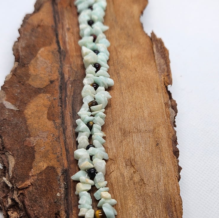 Beautiful compliment of colour with amazonite gemstone chips paired with tiger eye gemstones, handwoven with a delicate gold magnetic clasp. This bracelet measures just over 7.5". To check your fit, measure your wrist across the bone and add 1" to allow for a small drape. This bracelet will be gifted in a hessian or burlap drawstring jewellery bag.