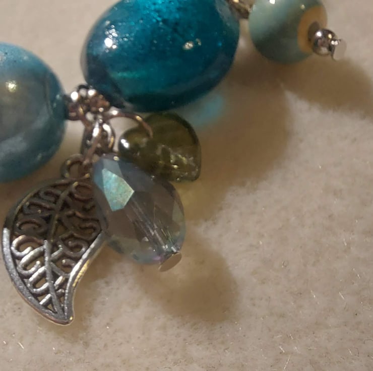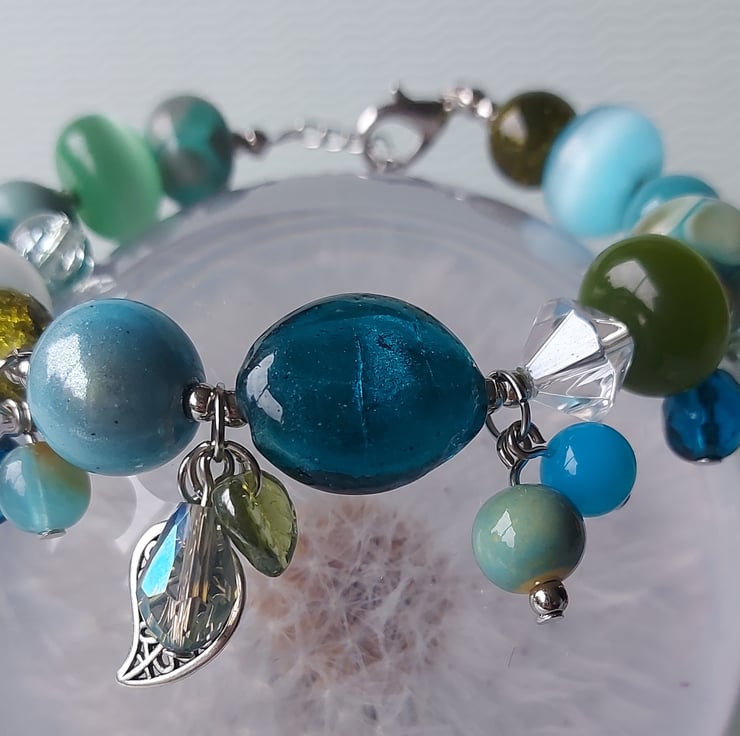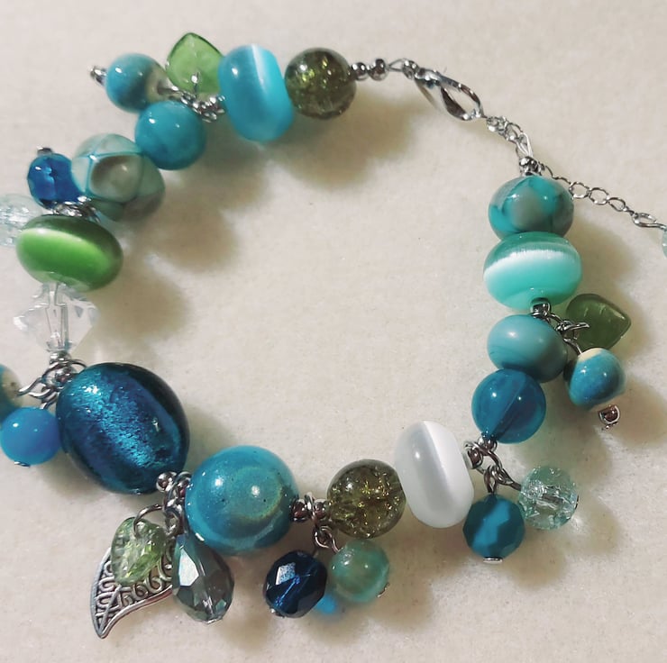 This bracelet fits from a 7-9" wrist. It is made of glass, acrylic, ceramic and handmade lampwork beads. Dangles of smaller beads add to the cluster look.