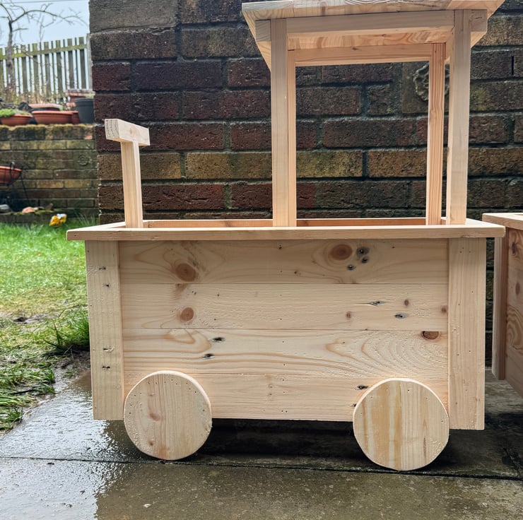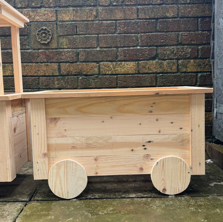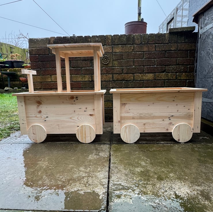 Add a touch of rustic charm to your garden with this handmade wooden train planter set, carefully crafted from solid pine in my UK workshop.