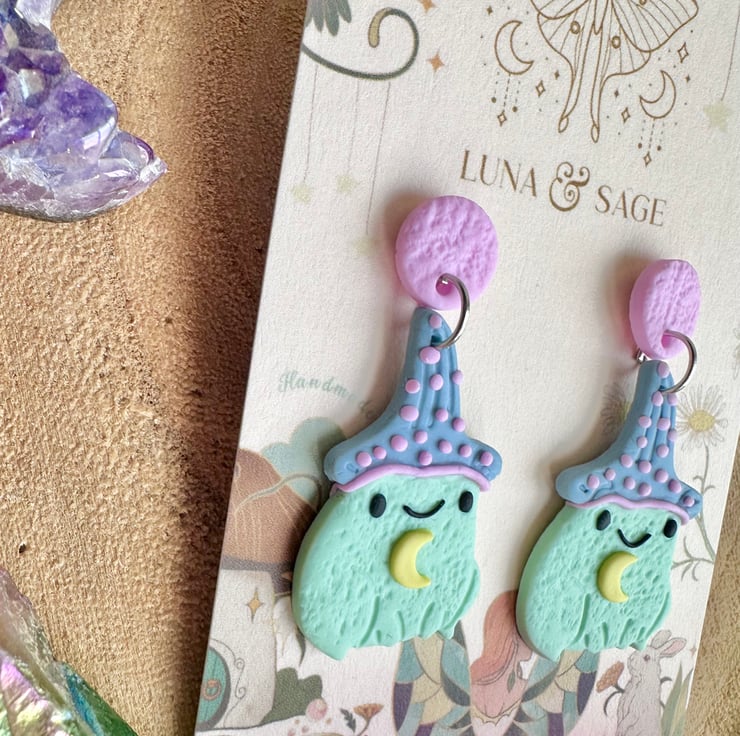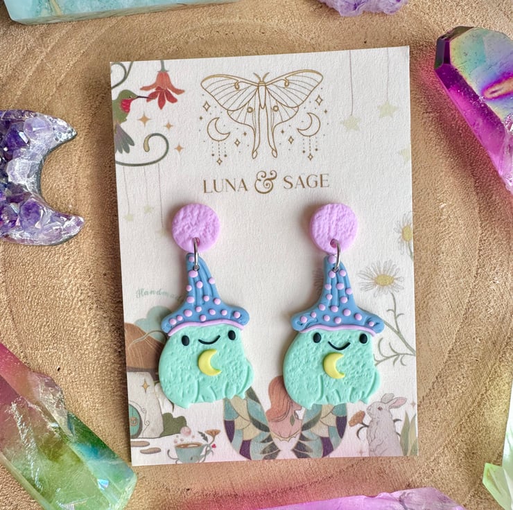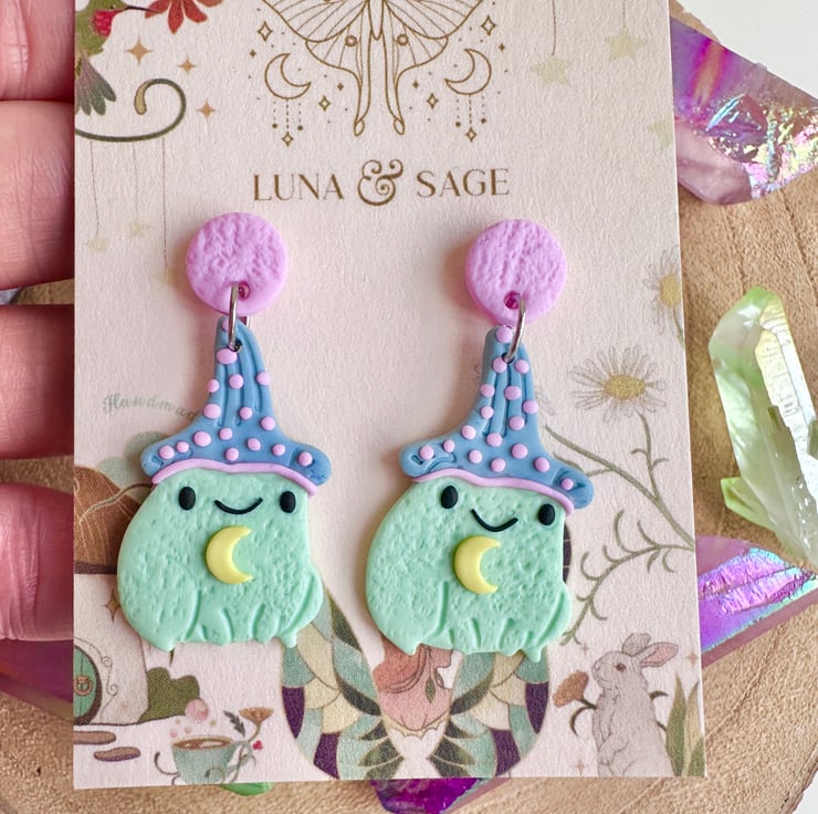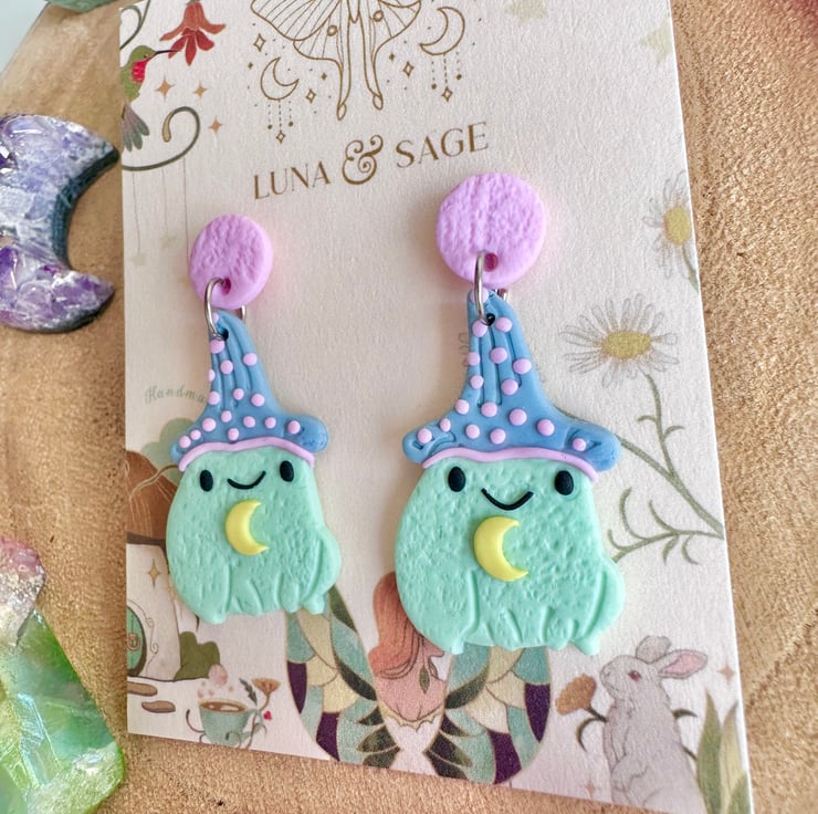 Fun!! Handmade whimsical frog wizard Polymer Clay Earrings with stainless steel findings.
