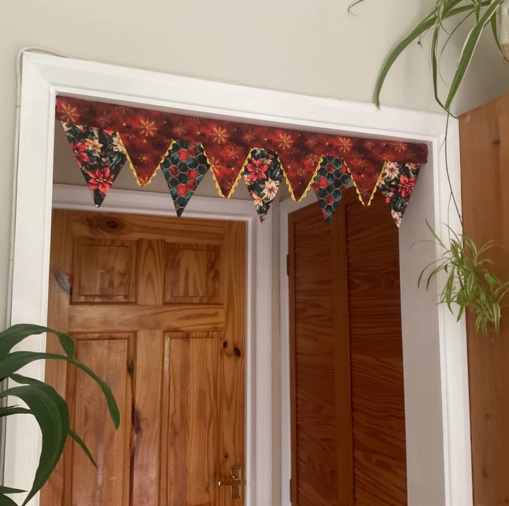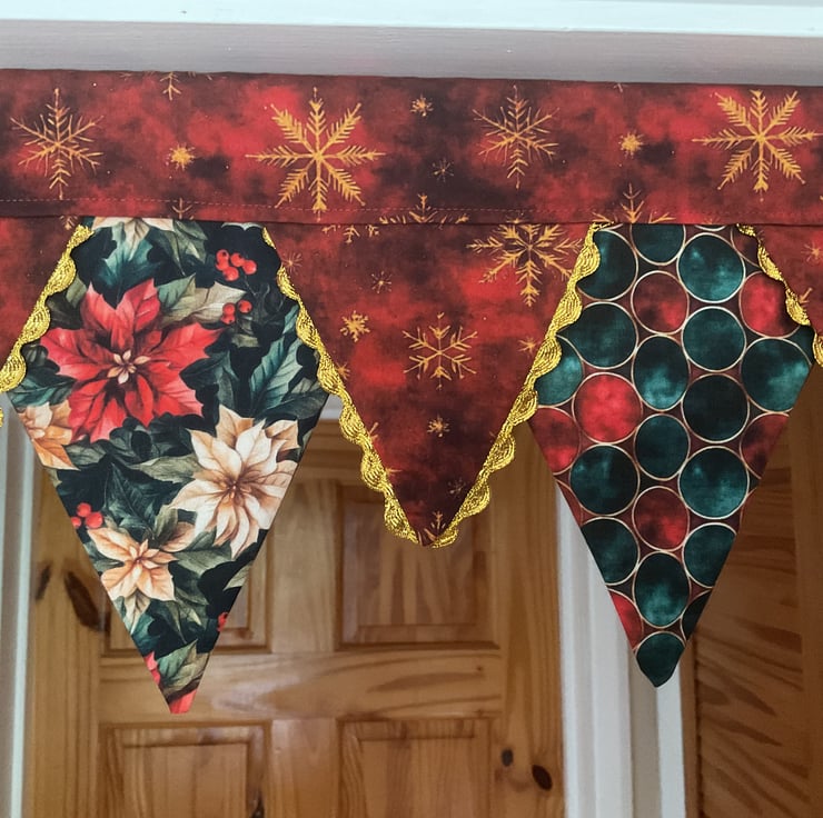 Designed and made at home by me, this pretty luxury Christmas bunting is designed to hang in a standard UK doorway with a slot top to allow insertion of a tension rod, making a tidy and attractive festive decoration. The bunting is double sided so looks pretty on both sides.
