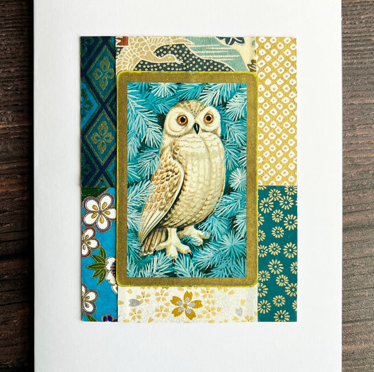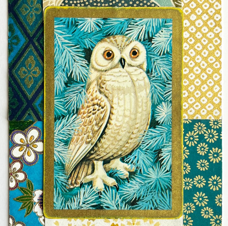I've made a small collage with a pretty vintage playing card in the middle featuring a snowy owl perched on frosty branches. I've bordered it with a selection of origami papers in shades of teal and gold. There are touches of metallic gold in the origami papers which adds a bit of sparkle.