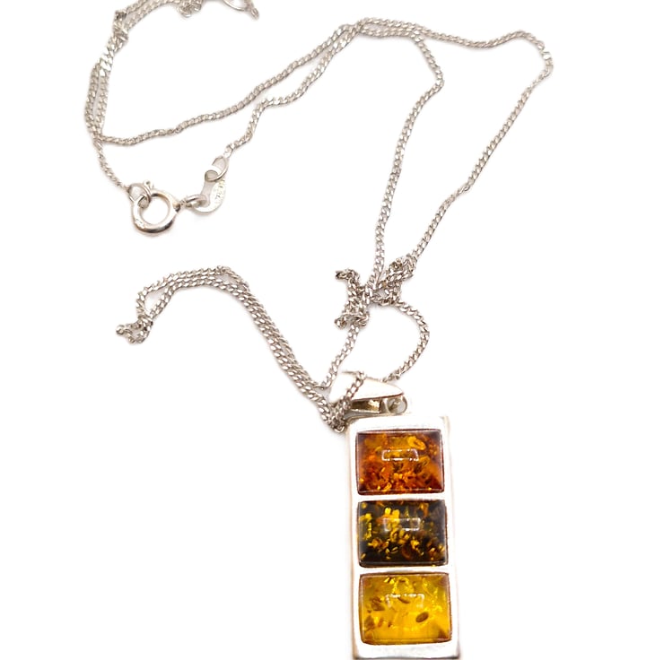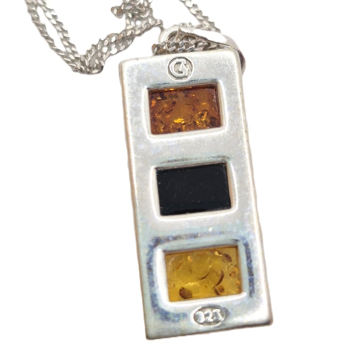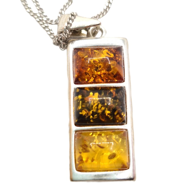 A sterling silver pendant which is set with 3 Baltic Amber stones in cognac, earthy, and lemon