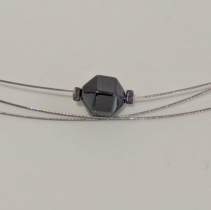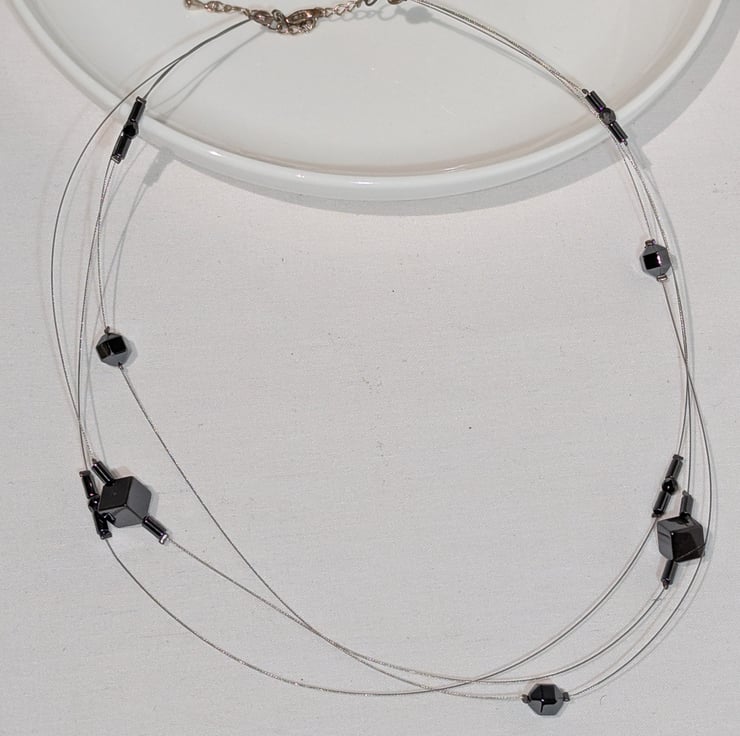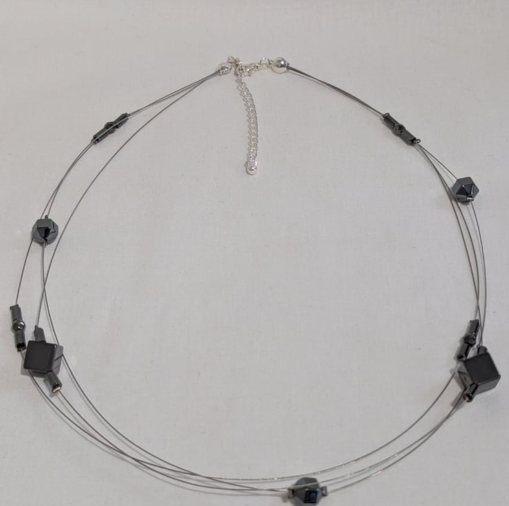 This beautiful necklace has 3 strands with cubes, polygon and small cylindrical hematite beads. The delicate brand wire and spaced beads give this an elegant look.