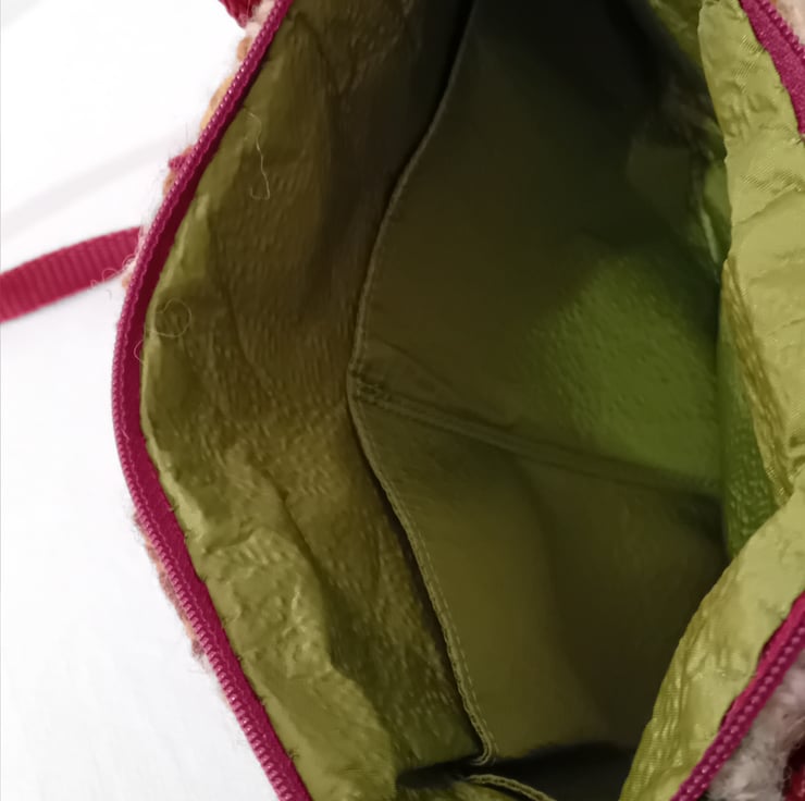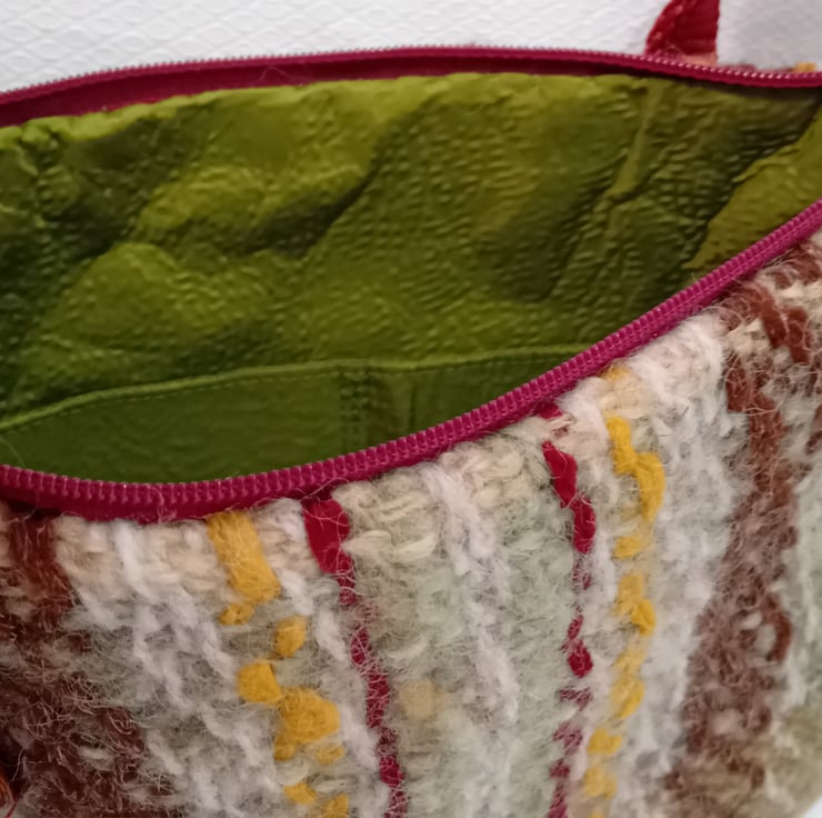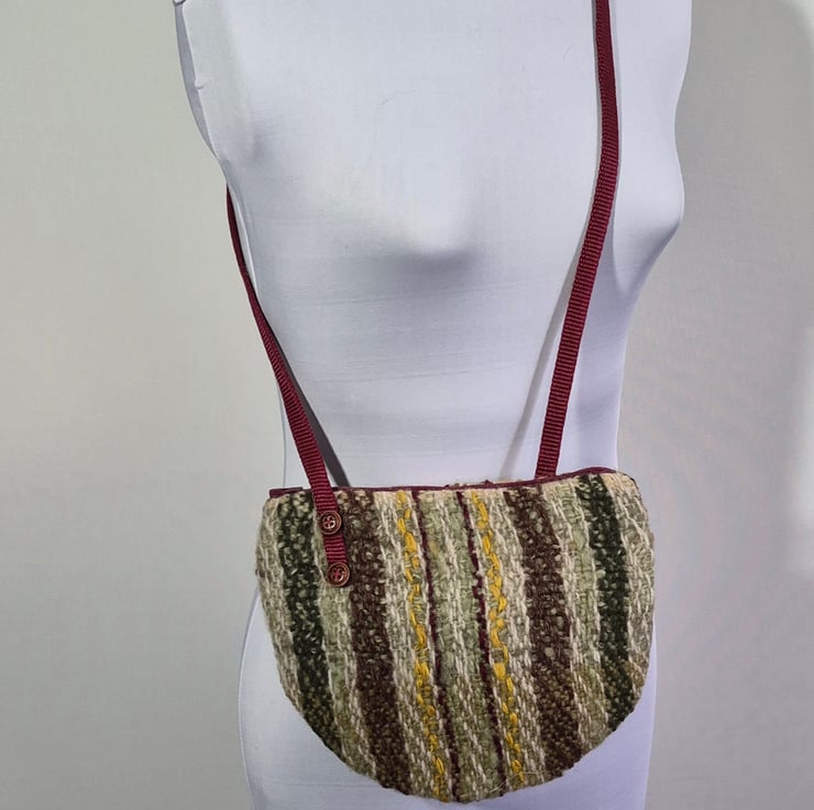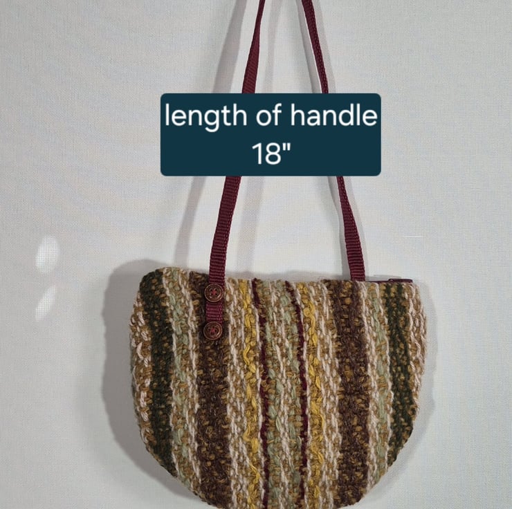 This bag is very well made with a zip closure for security and a full lining with pockets to keep you organized. it is hand woven including wool fibre that has been hand dyed and hand spun and has yarn of different textures It is mostly wool but has some synthetic yarn. For example the sparkle in the brown. The thin maroon stripe is acrylic .Most of the yarns are hand dyed with natural plant dyes collected locally.