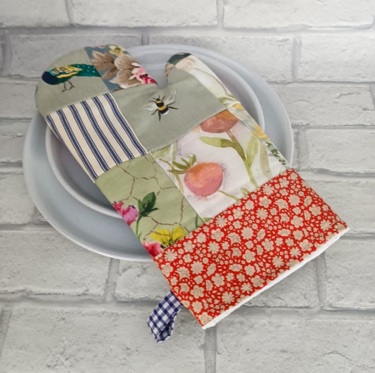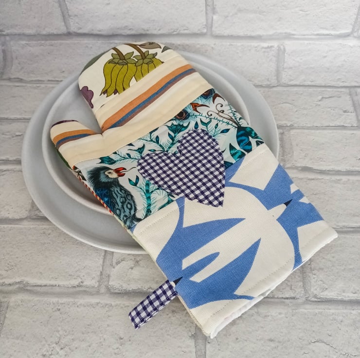 Each mitt is truly one of a kind, crafted from carefully selected reclaimed fabric pieces from previous projects. This sustainable approach reduces waste and gives new life to beautiful materials—making every mitt as unique as your kitchen.
