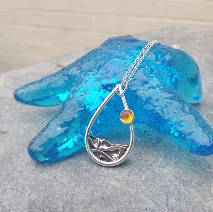 This pendant is perfect for anyone who loves the great outdoors. The sterling silver teardrop is made from 2mm round wire and has a layer of fine silver which has been folded to create the wave like texture. A 6mm amber cabochon has been added to represent the sun. It measures approx 23mm across at it's widest point and 36mm from top to bottom and hangs from a sterling silver belcher chain which fastens with a bolt clasp.