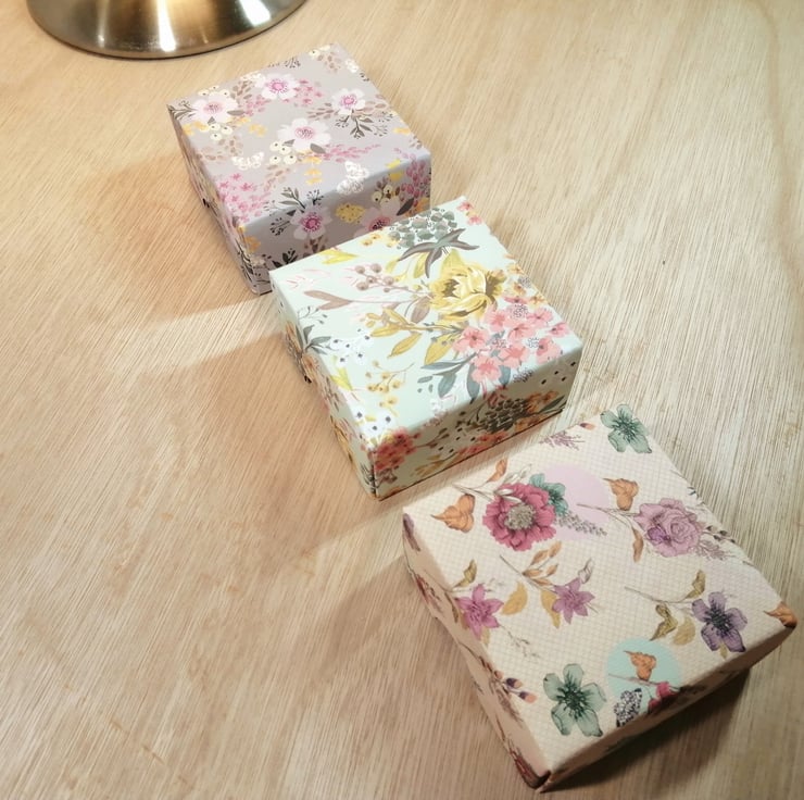 A set of three, handmade, small gift or presentation box with separate lids. Each box is handmade from top quality ‘First Edition’ paper designed by Louise Tiler in the range 'Paper Flowers' which is now very difficult to come by. These are handmade boxes, not machine produced. Each box is approximately 7cm square by 3.5cm high.