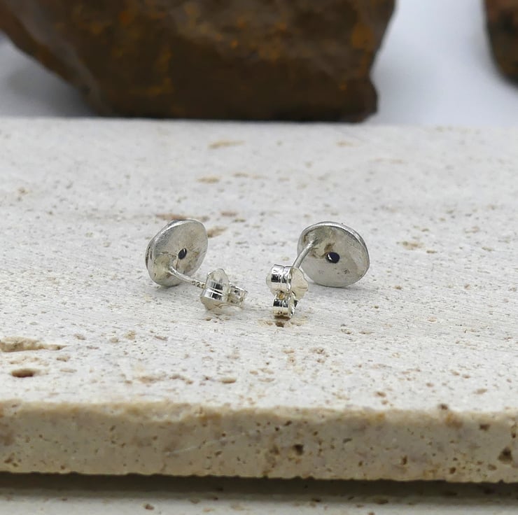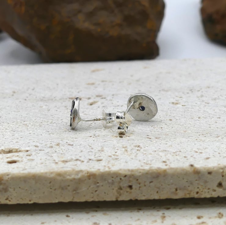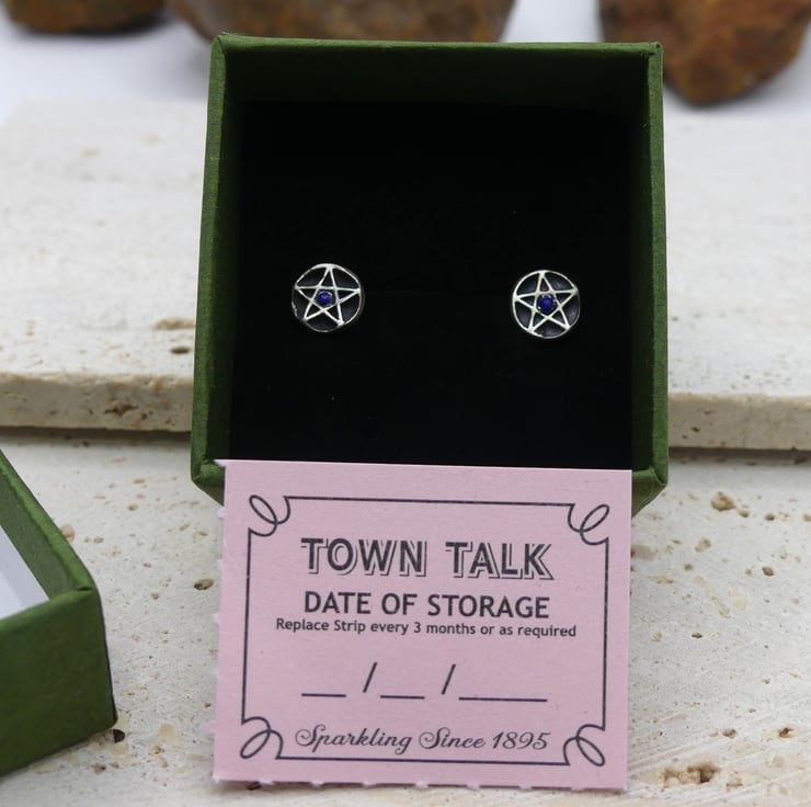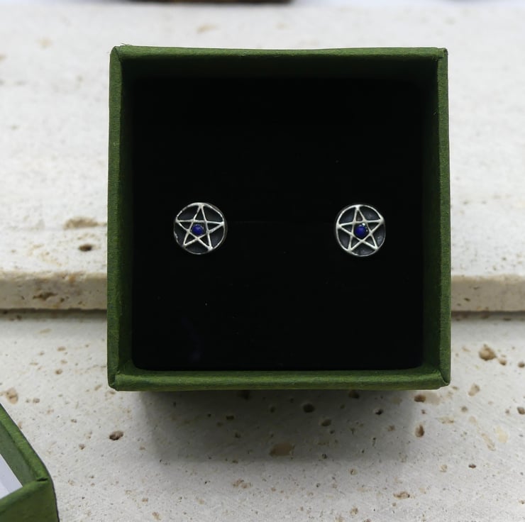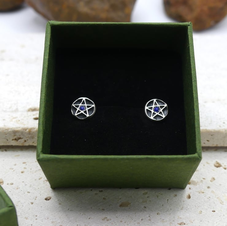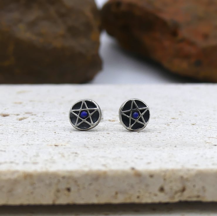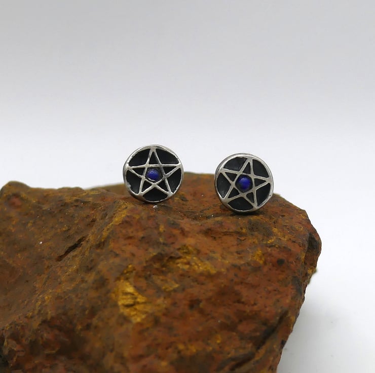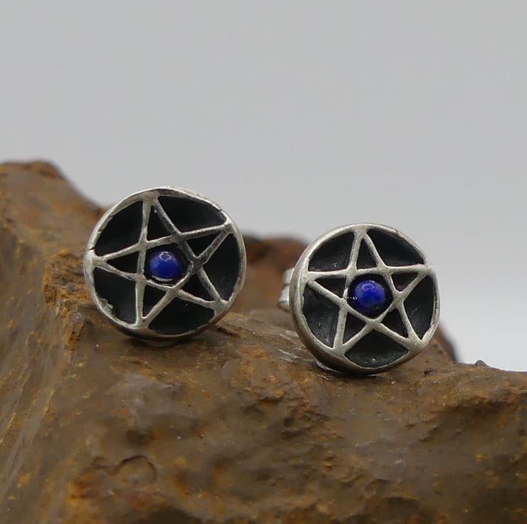 Recycled Sterling Silver Pentacle Stud Earrings with 2mm Lapis Lazuli Gemstones.