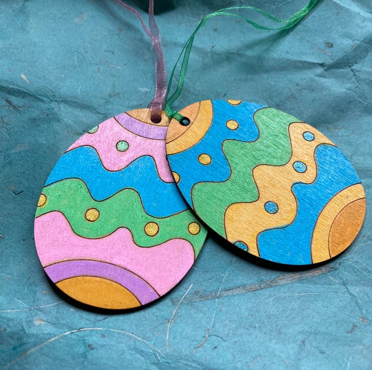 A set of 6 wooden eggs hand painted in a mix of designs. They hang by organza ribbons.