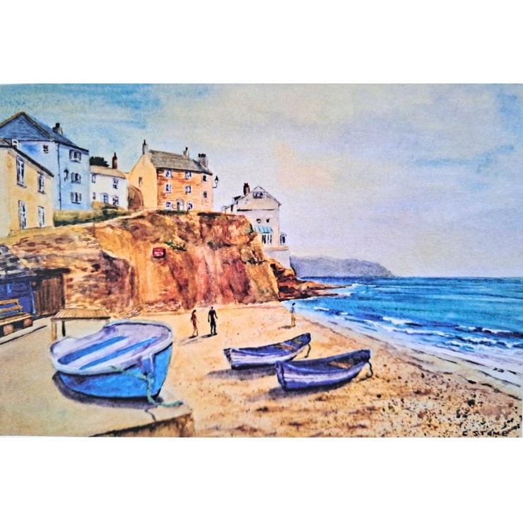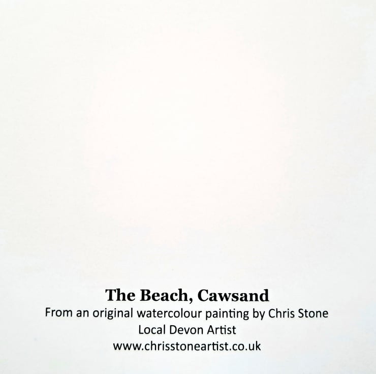 A professionally produced greetings card reptoduced from my original watercolour painting of The Beach at Cawsand, Cornwall on a bright day. Cawsand is a beuatiful village on the unspoilt Rame Peninsula.