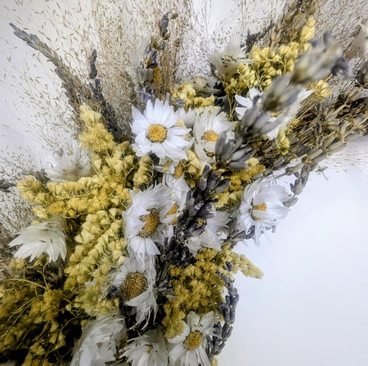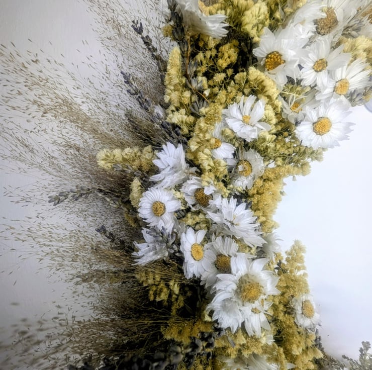Agrostis drifts through in airy veils, meadow light caught in motion, inviting the mind to wander and the spirit to stretch. Lavender threads its familiar violet calm through the circle, soothing and steady, encouraging gentle reflection rather than restless thought. Solidago flares in warm gold, long associated with encouragement and good fortune, its brightness like a small sun resting at the heart.