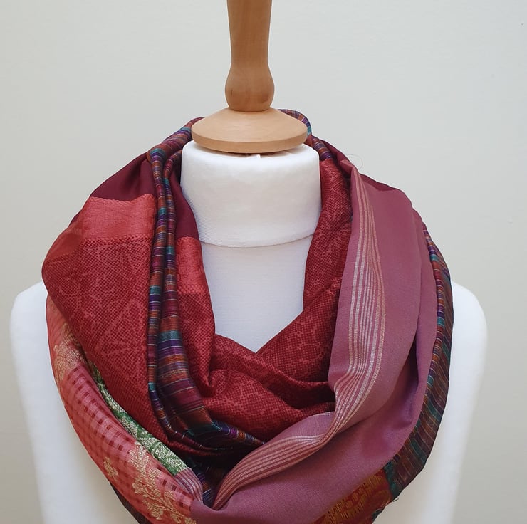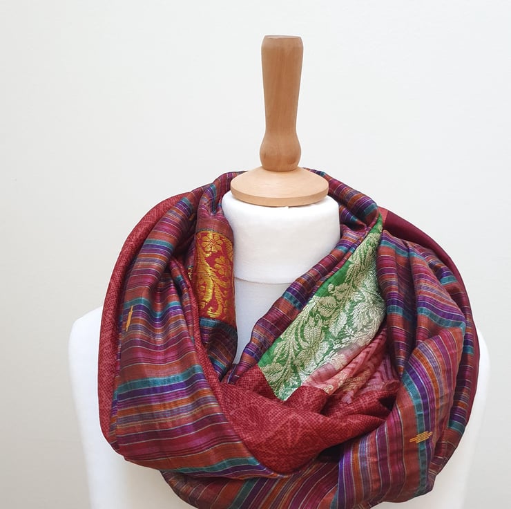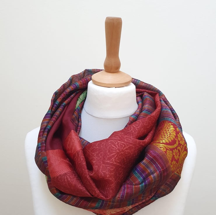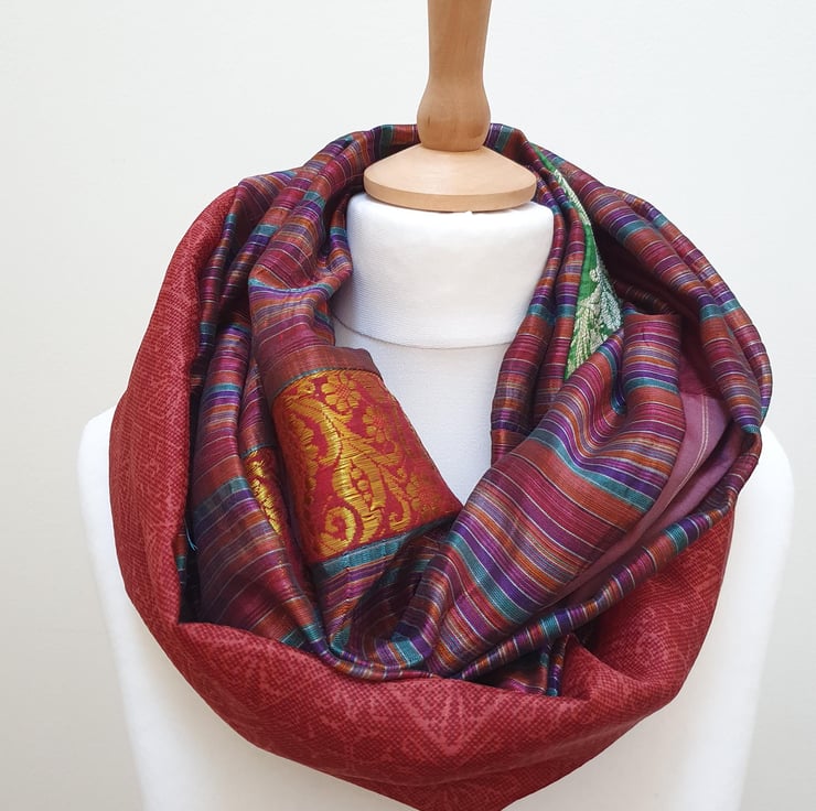 My sari silk double sided infinity scarf is handmade, sitting neatly around your neck. All of the comfort and warmth of a normal scarf without the bulk. Colours are carefully chosen to complement each other and the scarf can be worn in a multitude of ways.