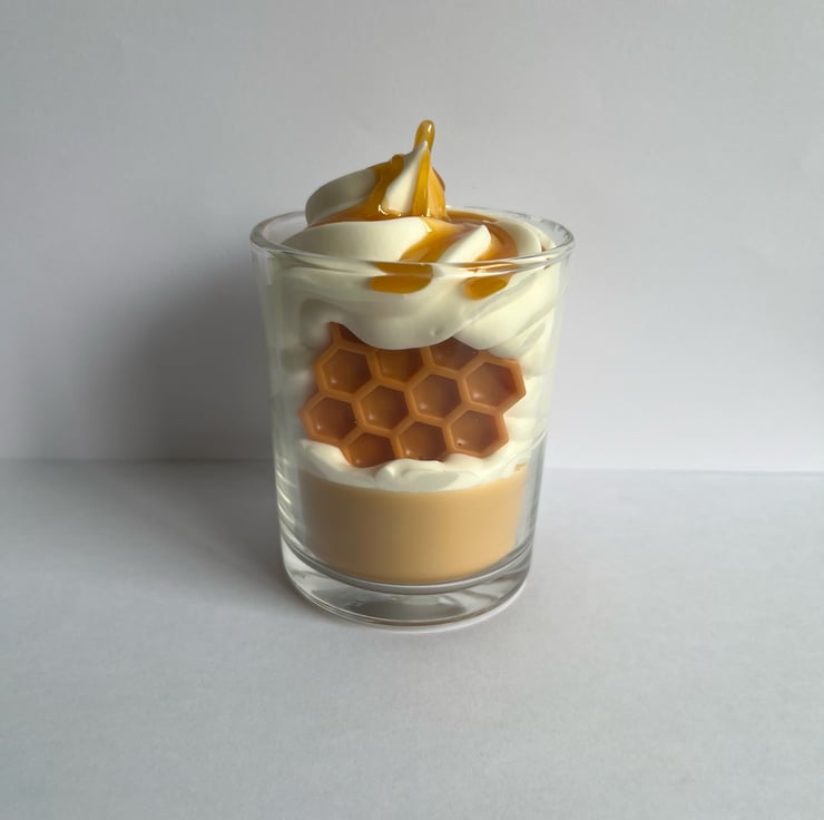 A tribute to golden honey, this handcrafted candle features a glossy honey-like drizzle, a delicate honeycomb detail, and a luscious whipped wax topping.