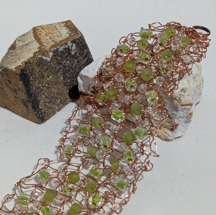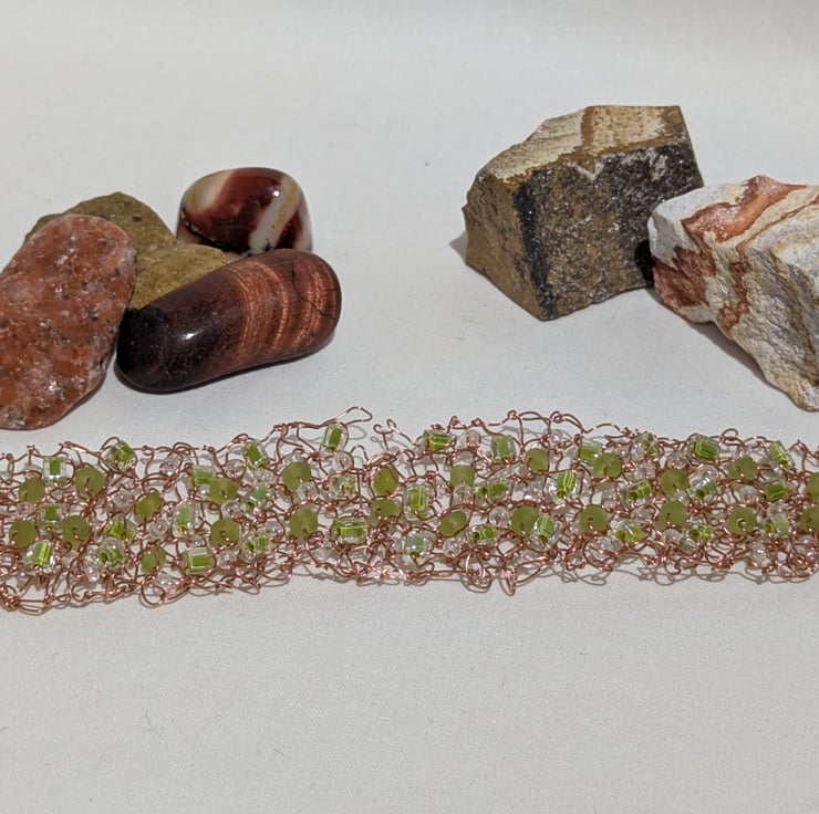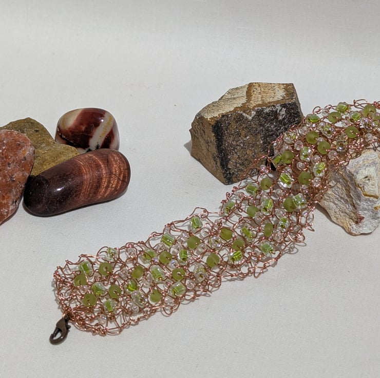 This lovely bracelet is knitted using ordinary knitting needles and copper wire, adding seed beads and miuyuki beads to the stitches. The fastening is an antique brass lobster claw and jump ring.