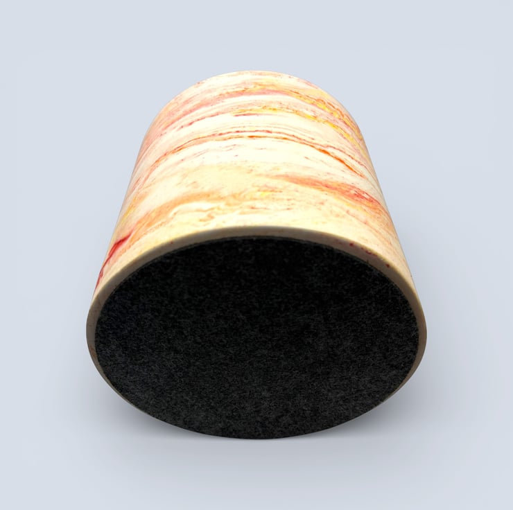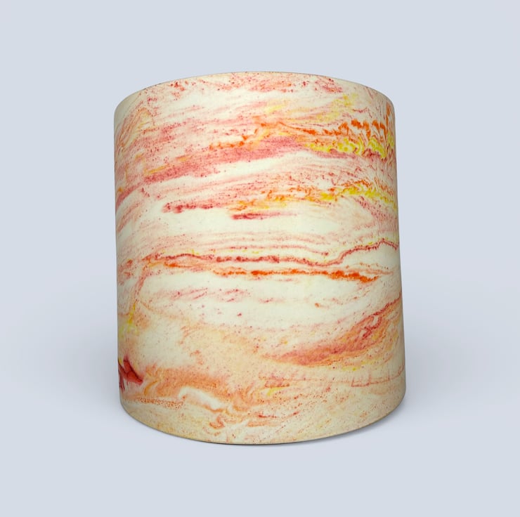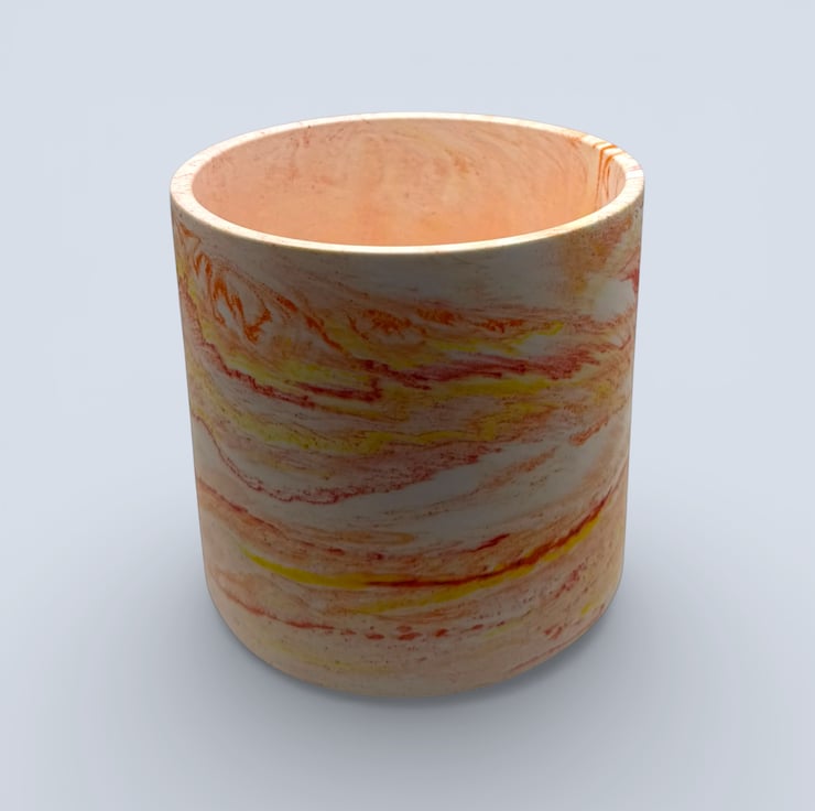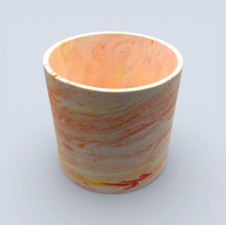 The pot is handmade from a water based mineral material with a smooth, stone like feel. The marbled colours run through the piece rather than sitting on the surface. The exterior has been hand finished through multiple stages and polished with a plant based wax sealer for an extra smooth finish, while the interior is sealed with varnish for added durability. Small air bubbles or gentle colour variations are part of the handmade process and add to the individuality of each pot.