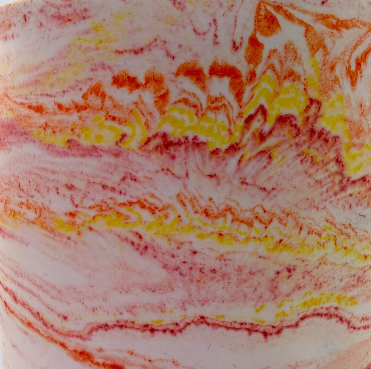 Handmade extra large marbled round plant pot for indoor houseplants. This statement planter features flowing bands of warm red, orange and yellow tones layered to create a bold sunrise inspired marble effect. The pattern wraps around the pot, making each piece one of a kind. It makes a thoughtful gift for plant lovers anyone who enjoys colourful handmade home decor.