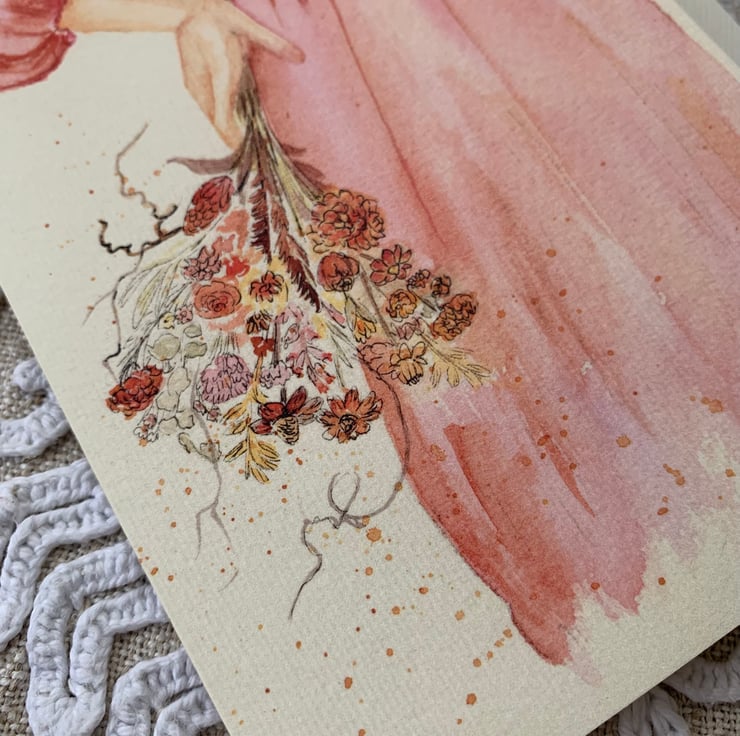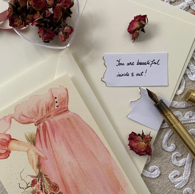 A beautifully printed A6 greeting card featuring my original watercolour illustration of a soft, vintage inspired dress. Professionally reproduced on premium Aquerello card stock, this piece has a gentle texture and timeless feel that makes it perfect for Mother’s Day, birthdays, thank you notes, or for anyone who loves feminine, nostalgic artwork.