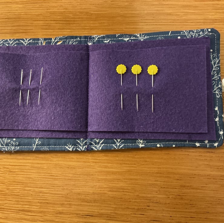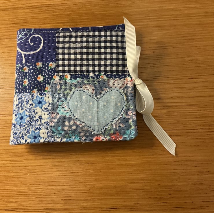 Needle book. Slow stitching project with an appliqué heart and lace, tied with a ribbon bow.