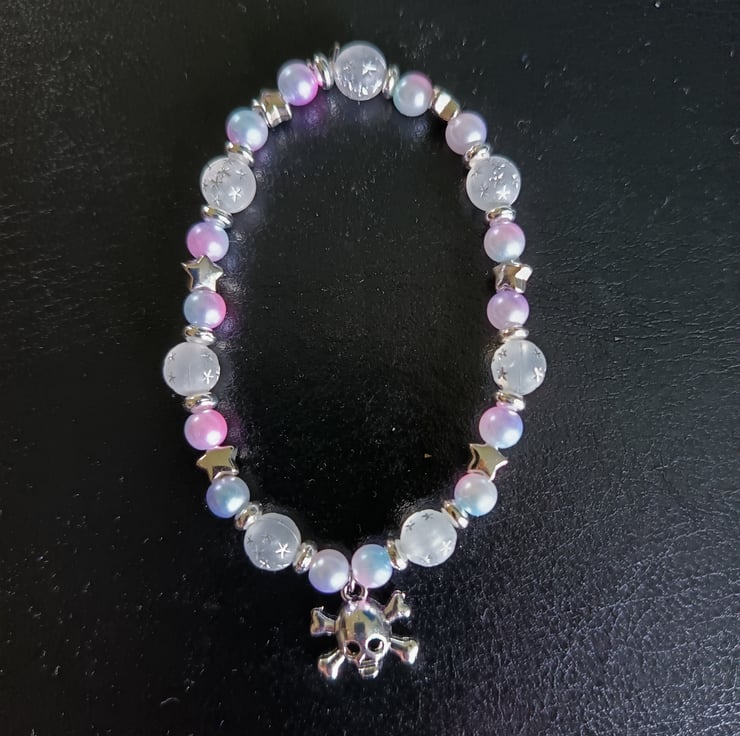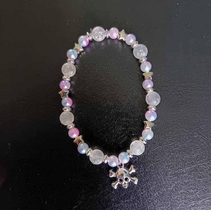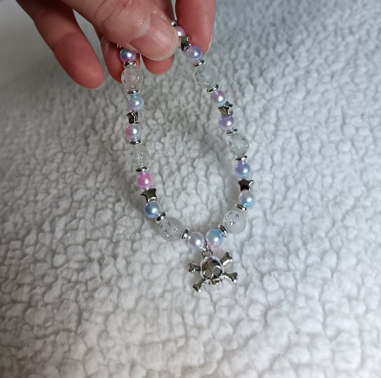 This handmade bracelet is crafted with magic stretch elastic, pastel faux pearl beads, decorative silver spacers, a silver skull and crossbones charm and clear glass beads with silver star pattern.