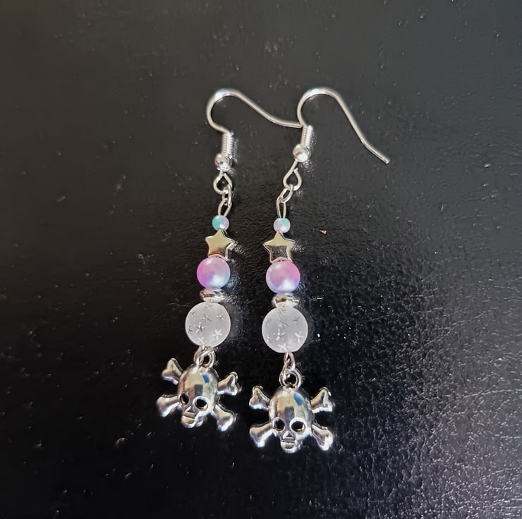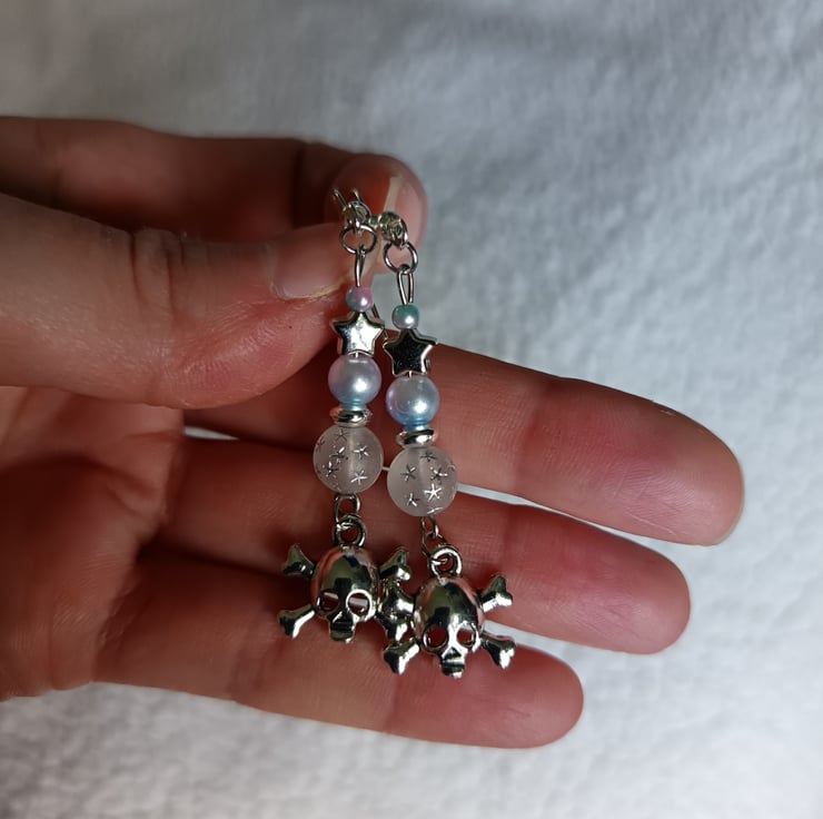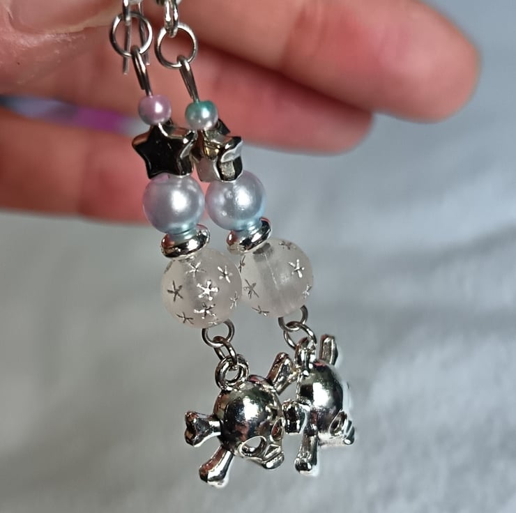 These handmade earrings are crafted with stainless steel hooks, silver skull and crossbones charms, silver star beads and glass beads in pastel faux pearl and clear AB with silver star pattern.