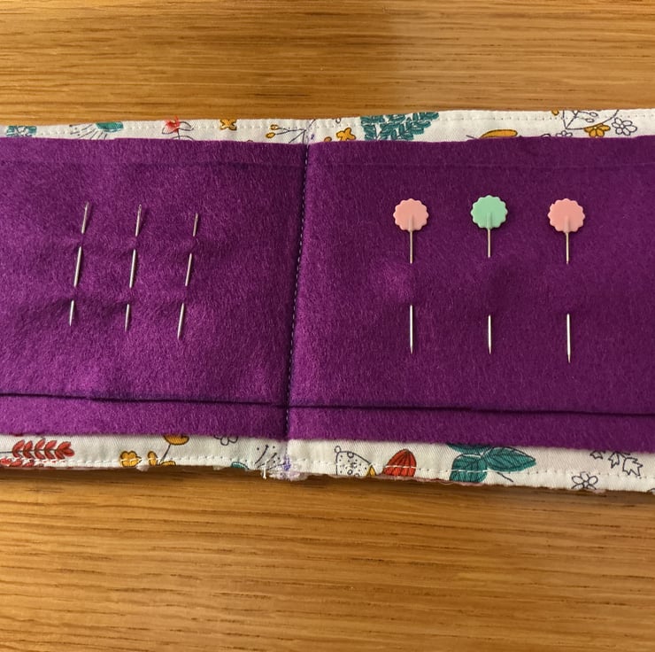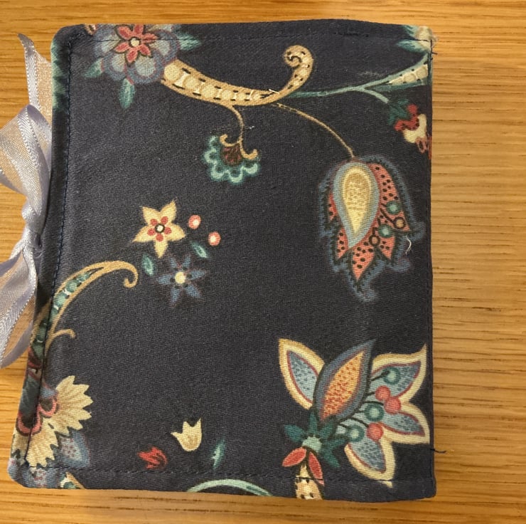 Needle book, I used a dark blue material pattern with a pretty floral design and paired it with a beautiful lace flower tied with a soft blue ribbon bow.