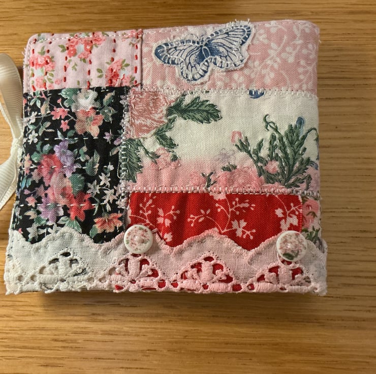 Pretty needle book, I have used a patchwork of materials, stitched with a mix of slow stitching and machine stitching, with buttons, cotton lace and an appliqué butterfly, tied with ribbon.