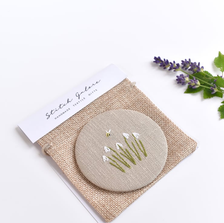 Little embroidered snowdrop flowers and a tiny bumble bee are delicately hand sewn onto natural linen fabric, covering the back of the round mirror.