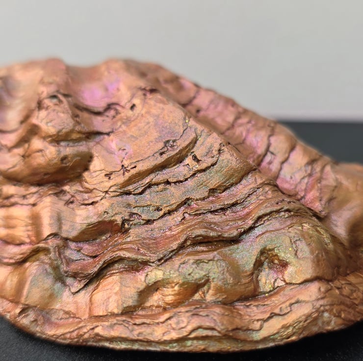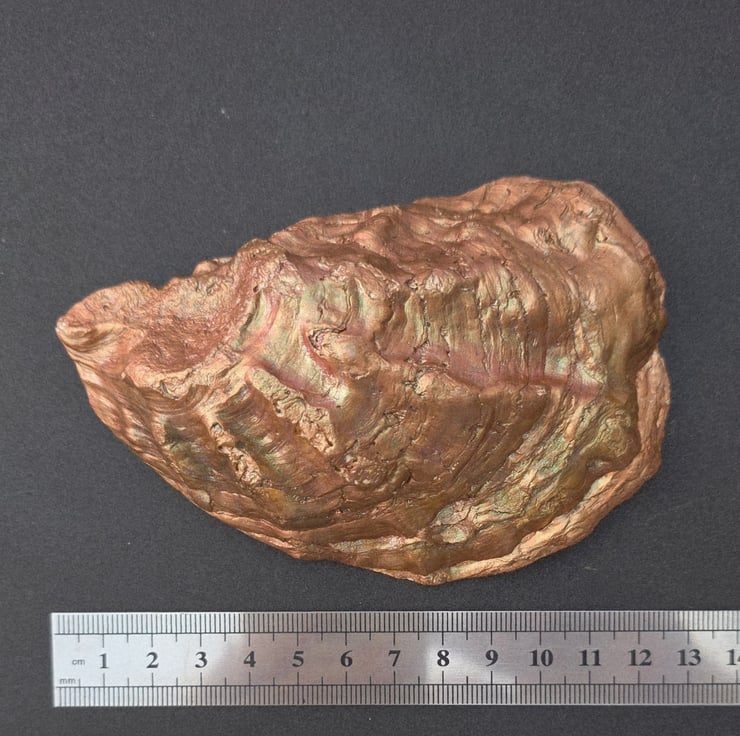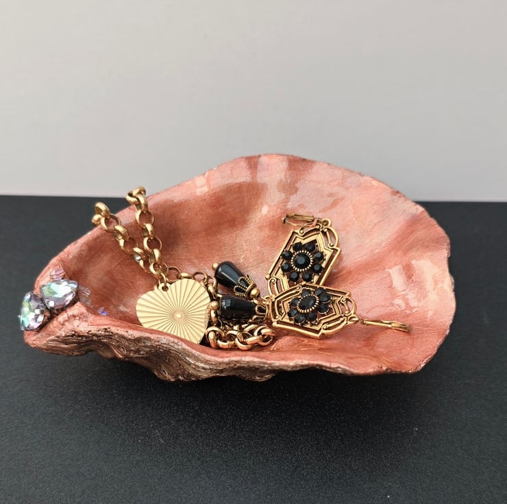Perfect as a ring dish, or somewhere to drop your crystals or pins as you work, this ethically sourced oyster shell is hand decorated with acrylic paint, faux jewels, and finished with UV resin for maximum longevity. The outside of the shell has been finished with bronze gilding wax and a chameleon pigment to enhance its many interesting layers.