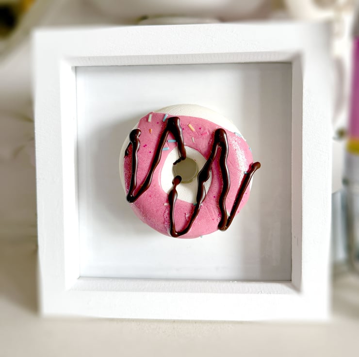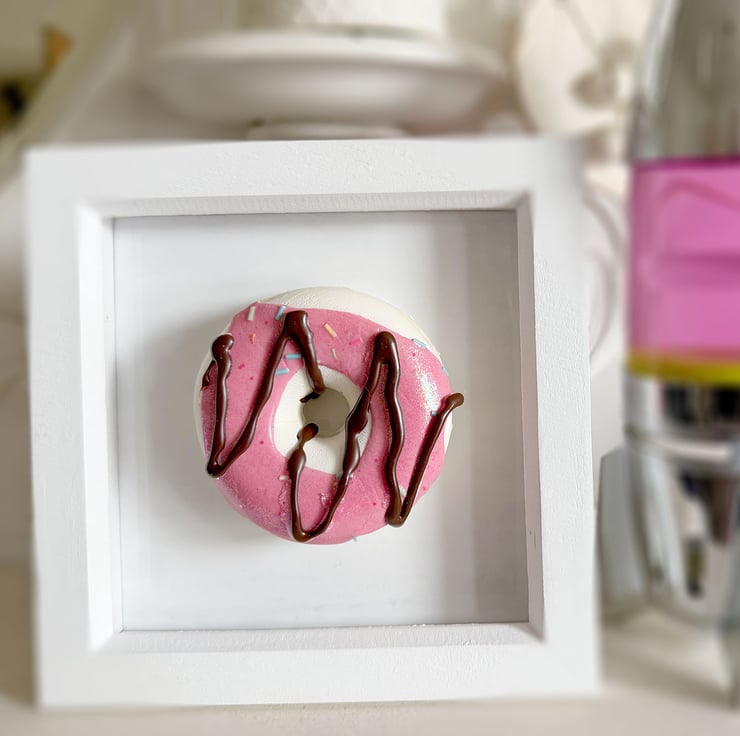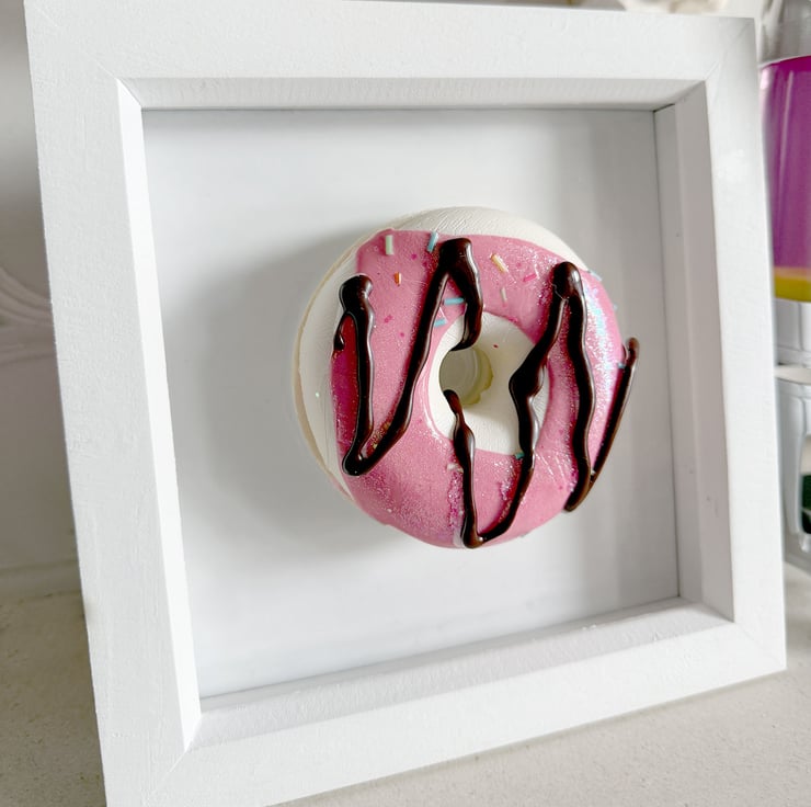 Fake pink food art donut with chocolate sauce in a white frame with a white glossy resin background. Measure approx 10 inches square.
