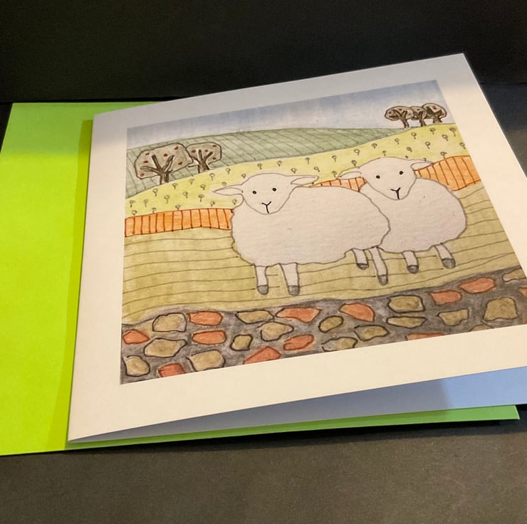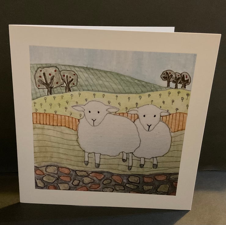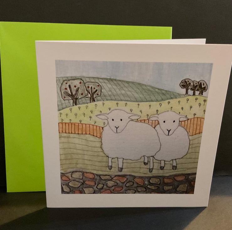 Sheep waiting in the fields ,is a modern design in marker pen. This fun greetings card is blank inside for your own message .The card would be suitable for a birthday , friend ,relative , as a thank you card , or maybe for an animal lover