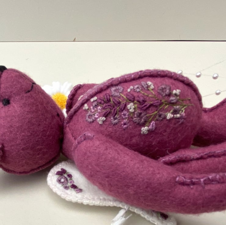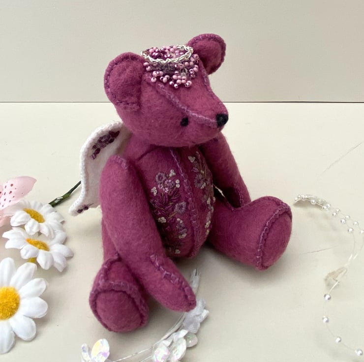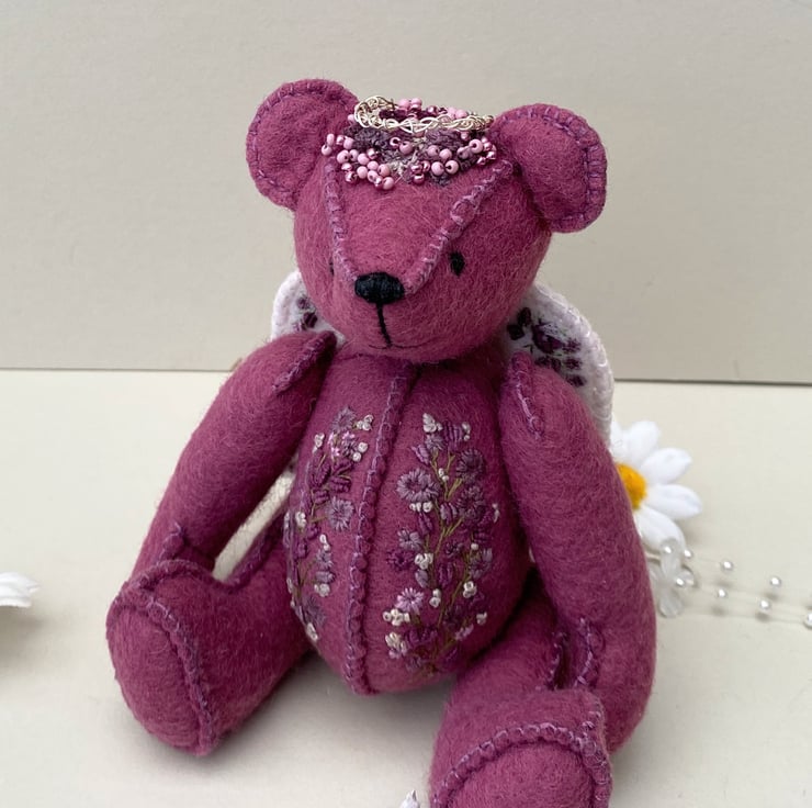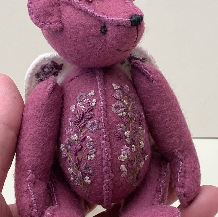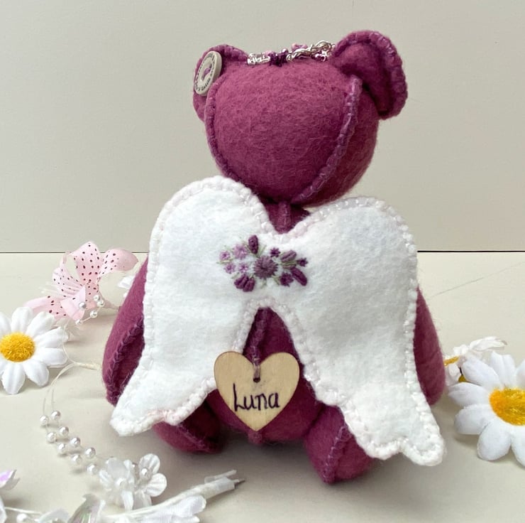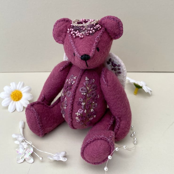 Luna has white Angel wings in 2mm wool felt which have been decorated with hand embroidery to the corners of her wings that show from the front of the bear and a small motif to the back