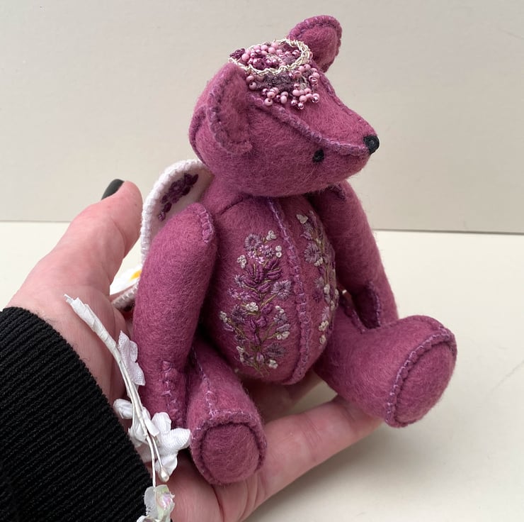 Luna is 6" tall, part of my Signature range of collectable bears, she has been completely hand sewn with triple seams to the right side of the fabric for strength and longevity. Made from magenta 100% wool felt she is highly detailed with beautiful floral hand embroidery to her body pieces in magenta, deep pink shades with green stems and using various stitches.