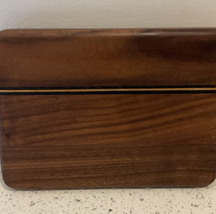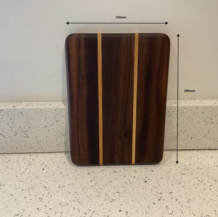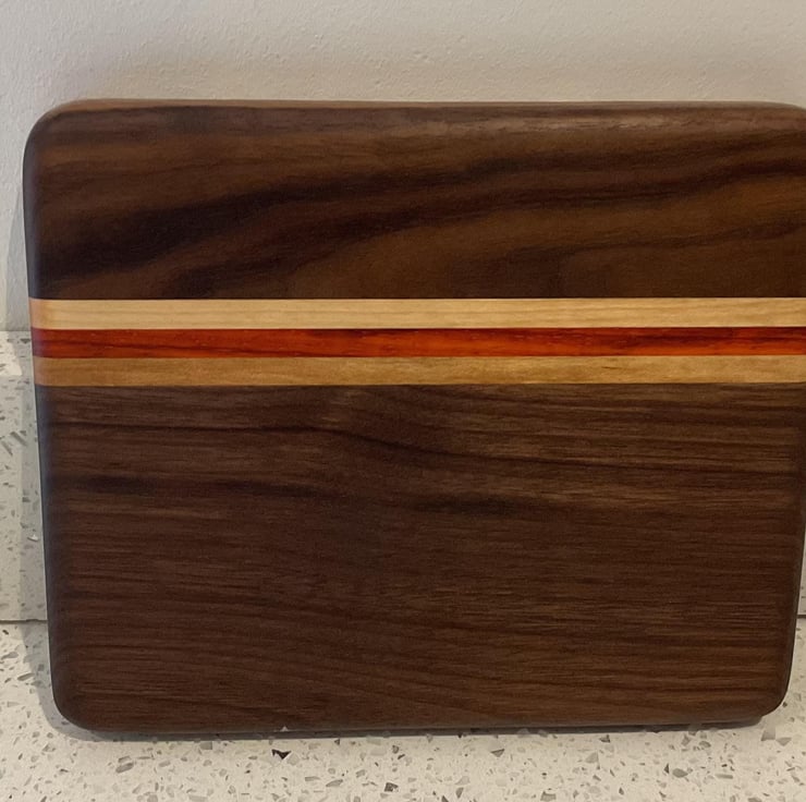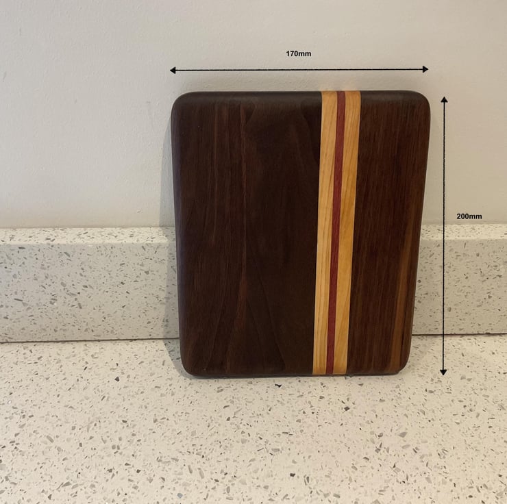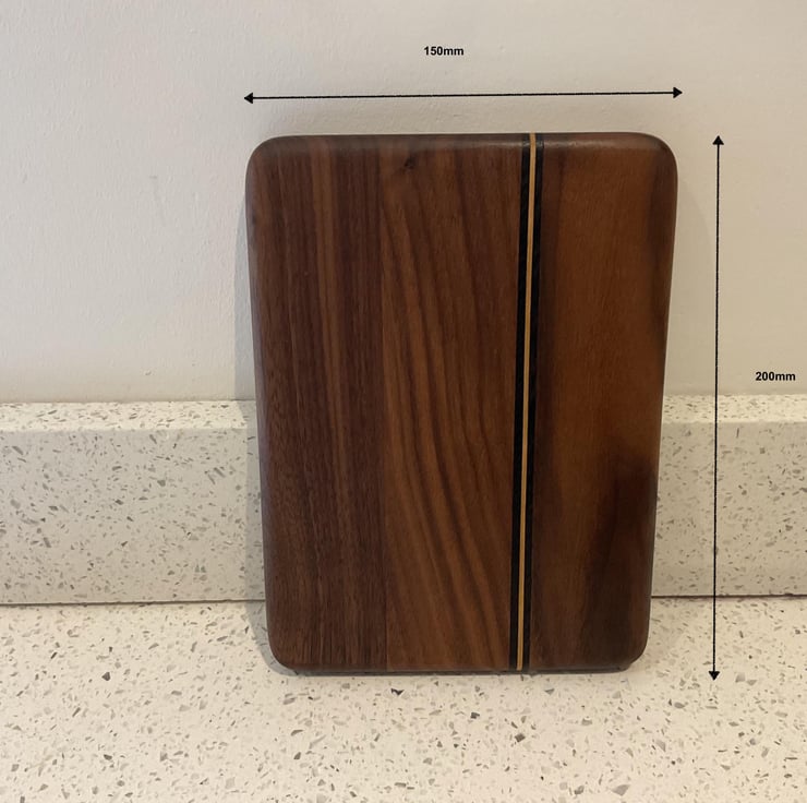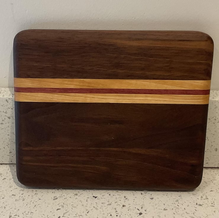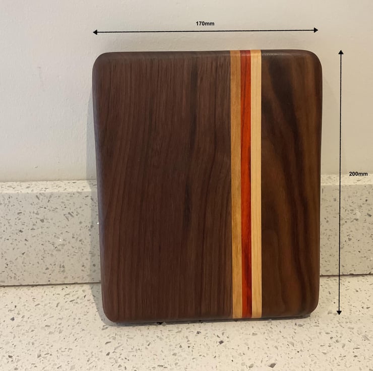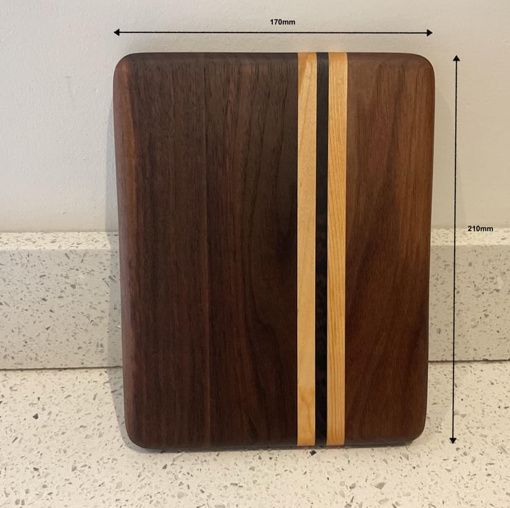 Refined serving boards featuring warm walnut wood complemented by carefully selected inlays of maple, padauk, cherry, purple heart and wenge. Measuring approximately 18mm in thickness and various sizes, these boards deliver both visual impact and practical heft for entertaining. Designed with the cheese board enthusiast in mind, they showcase artisanal craftsmanship and natural wood grain. Protected with food-safe mineral oil and wax, they're built to develop character with use whilst maintaining their lustrous finish.