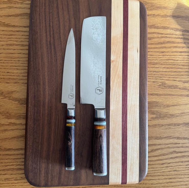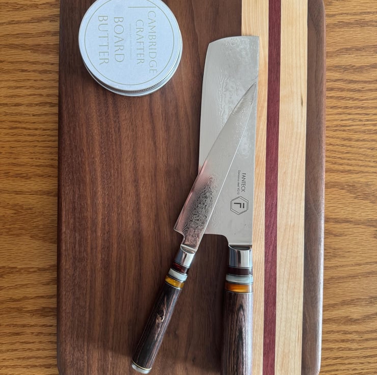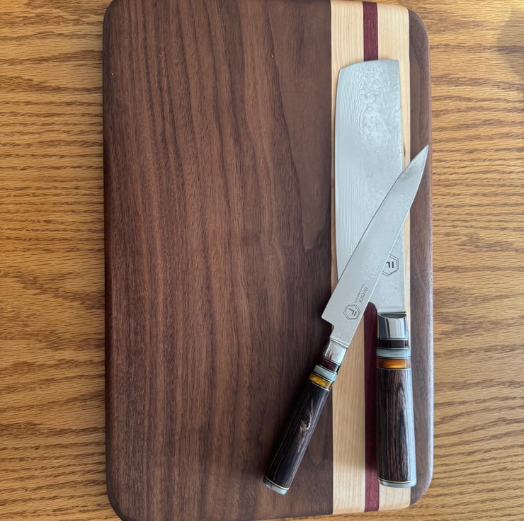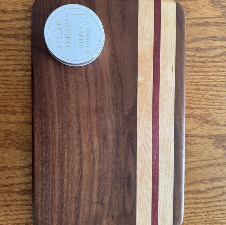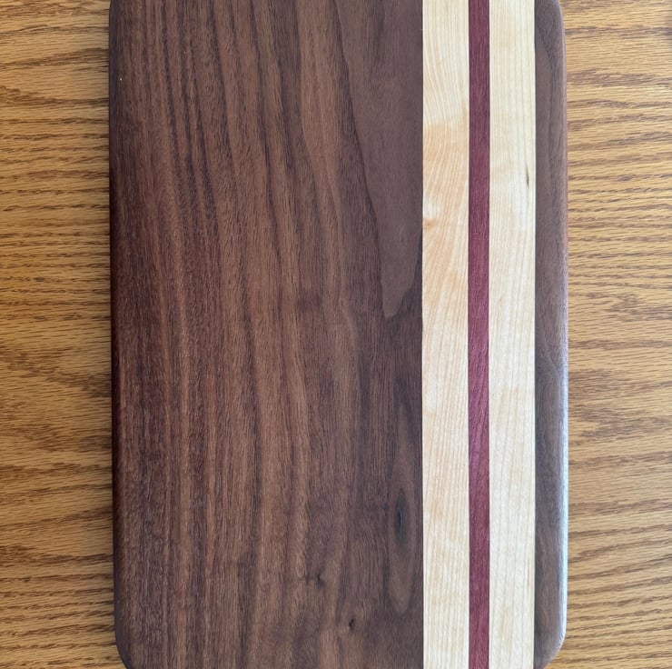 This sophisticated serving and cutting board features a harmonious blend of Walnut, Maple, and Purple Heart woods, expertly crafted to dimensions of 235mm by 375mm by 22mm with elegant rounded corners. Its smooth finish and durable construction provide a refined surface ideal for both food preparation and elegant presentation.