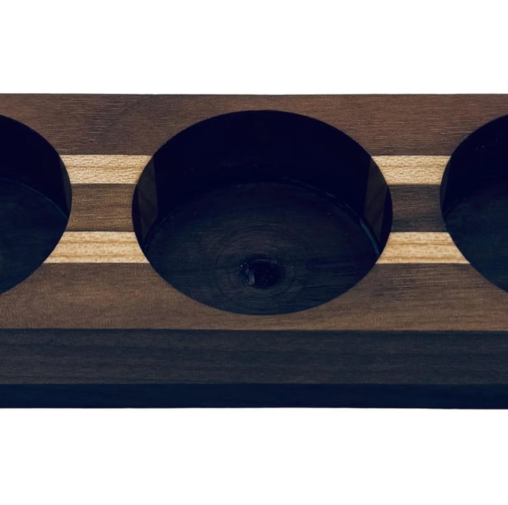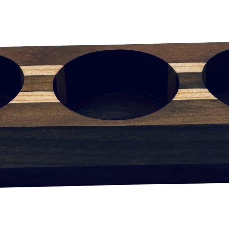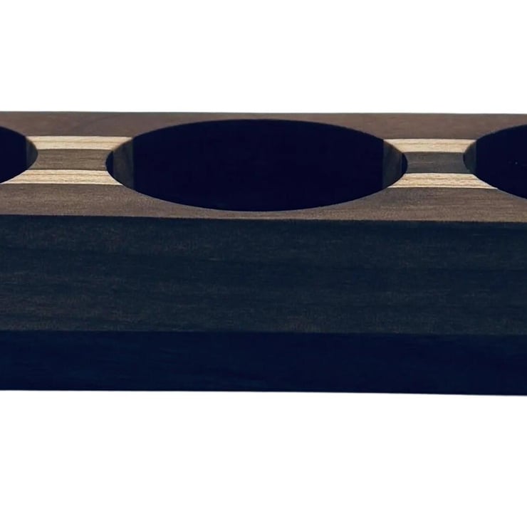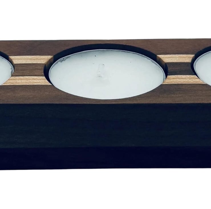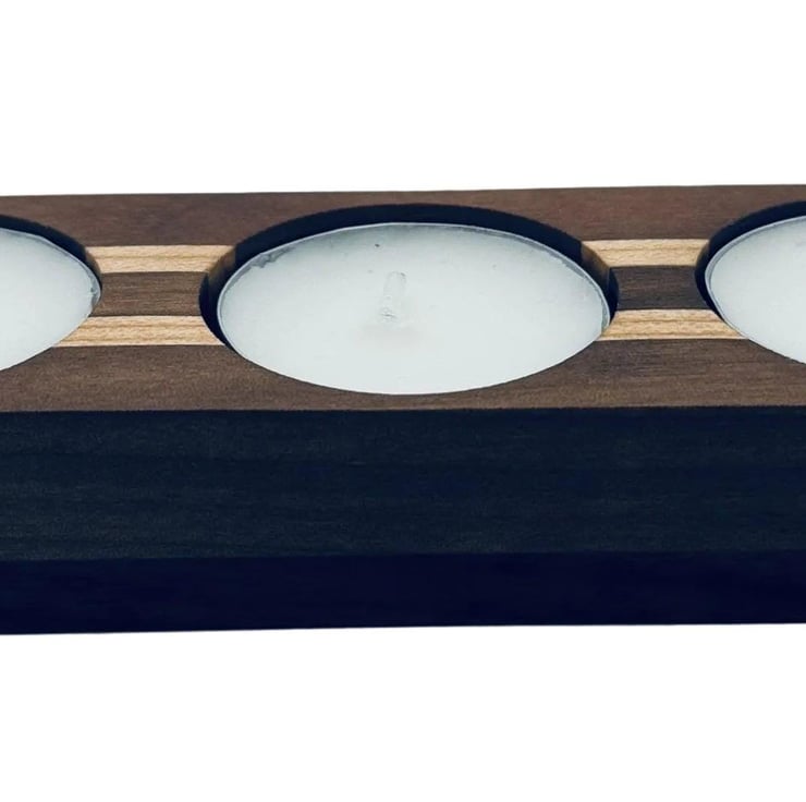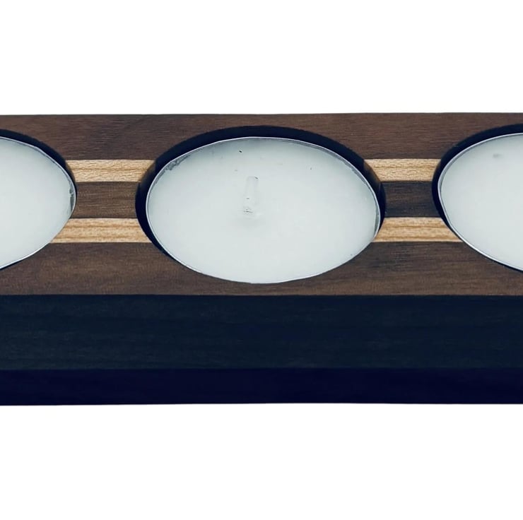 Elevate your space with this elegant candle holder, featuring a striking striped design crafted from rich walnut and light maple. Its sturdy walnut base securely holds three tea lights, creating a warm, inviting ambiance with a refined touch. Perfect for adding sophistication to any setting.
