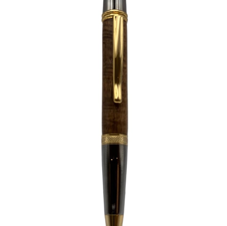 Introducing the Stalwart, a twist-action ballpoint pen that blends timeless sophistication with dependable performance. Its sleek, tapered silhouette, accented by elegant gold details and a refined clip, radiates understated luxury, while the ergonomic grip ensures comfort for every writing endeavor. With a smooth twist mechanism, the Stalwart reveals its precision-crafted tip, delivering a consistent, effortless ink flow for everything from daily notes to signing important documents. Designed to be both a reliable tool and a stylish statement, this handcrafted pen invites you to write with confidence, making every word a lasting impression of elegance and craftsmanship.