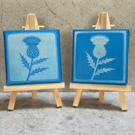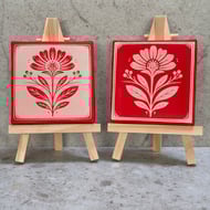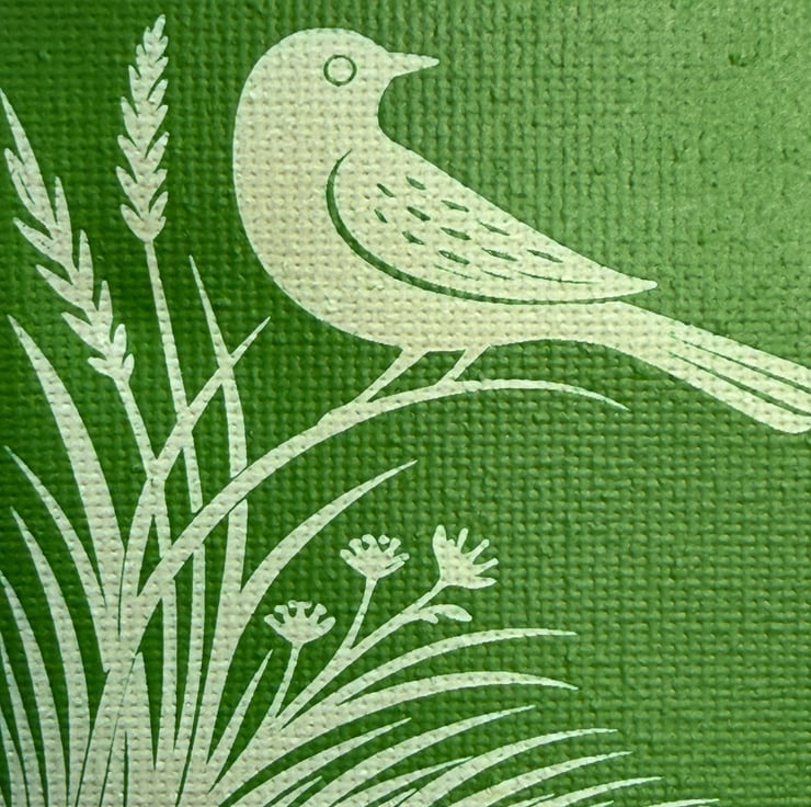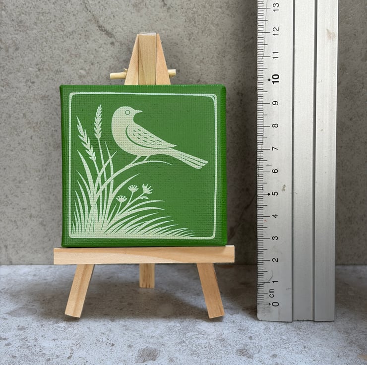 This 7.5cm square canvas features my original bird and meadow design, inspired by traditional folk art and 20th century woodcut printmaking. Each canvas is first spray painted in a rich green, then the design is laser engraved into the surface, revealing the natural canvas beneath and creating beautiful contrast and texture.